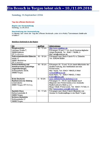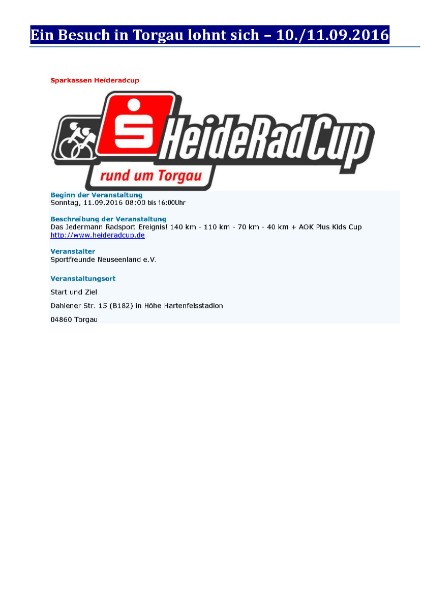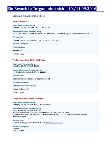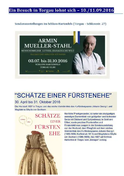 Da wir unseren Oldtimer-Teilemarkt am 11.September 2016 in Torgau ja nicht auf einer Insel betreiben, gibt es im lokalen Umfeld auch jede Menge andere Veranstaltungen an dem entsprechenden Wochenende. Somit lohnt es sich auch den nicht unbedingt Oldtimer-begeisterten Anhang mit nach Torgau zu bringen: -