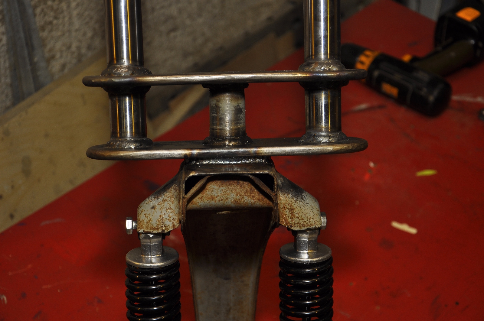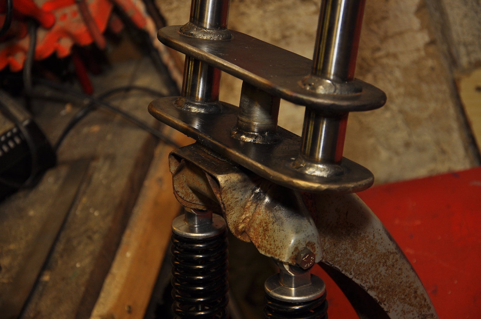 so, der Schwingenträger in Umbauphase eins. Sämtliche obenliegenden Öffnungen wurden geschlossen (Loch in der Mitte und unten sowie jeweils oben an den Stoßdämpferhalterungen) und die nur teilweise gezogenen Schweißnähte wurden rundumgezogen (an den oberen Stoßdämpferaufhängungen sowie an der Grundplatte der Lenkstange - warum Simson damals diese Schweißnähte nicht durchzog bleibt mir ein Rätsel). Nun hoffe ich, daß die Schlosserei die anderen Teile bis Heiligabend fertighat.
