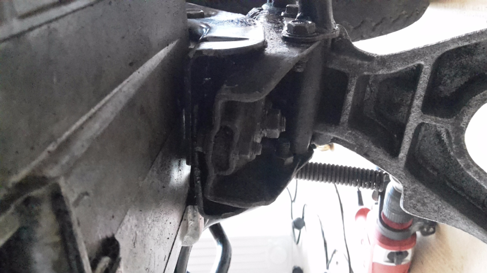 auf deinen Bildern sieht am unteren Motorlager so aus als wenn diese dicke Scheibe fehlt, weil die Laschen zu dicht am Rahmenfuß sind