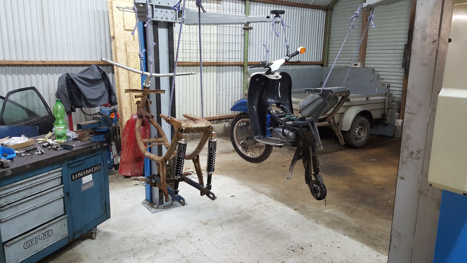 Die Schwalbe war sogar in meiner Nähe und war schnell geholt. Da der Rahmen im hinteren Bereich krumm war und ich noch einen zweiten Rahmen Liegen hatte, ging es gleich an das Anpassen und den Anbau der Krürzeren Dämpfer