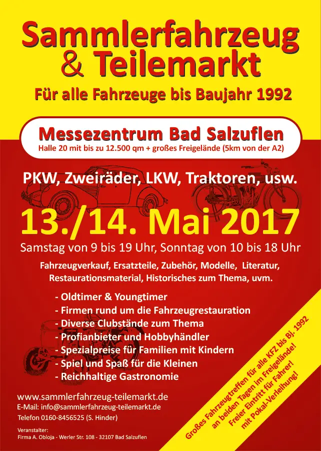Wir veranstalten in diesem Jahr am 13. und 14. Mai 2017, wieder einen grossen "Sammlerfahrzeug- und Teilemarkt" im Messezentrum in 32108 Bad Salzuflen.