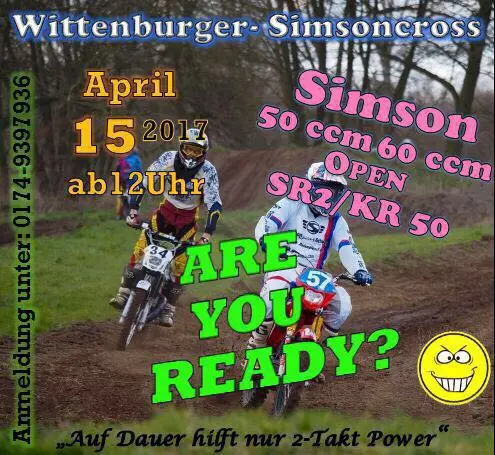 Am 15.04.2017 sind alle Simsonfanatiker eingeladen, nach der Winterpause wieder eine Nase feinsten Zweitaktduft zu inhalieren. Es steht das 18. Simson-Cross in 19243 Wittenburg (Strecke bei Dreilützow) an. Neben der etablierten, offenen Simsonklasse wird es ein weiteres Highlight in Form eines SR2/KR50-Rennens geben. Die sogenannten "Essigpisser" sind allen Ostfahrzeugfreunden ein Begriff und sollen der guten, volksfestartigen Stimmung die Krone aufsetzen. Es wird ab 12 Uhr jeweils ein freies Training und zwei Wertungsläufe a 12min+2Runden ausgetragen. Am Ende des Tages gibt es ein Hauen und Stechen um den begehrten "Goldenen Helm" einen Wanderpokal,dessen Sieger mittels Handicap-Rennen ermittelt wird. Interessierte Simsonfahrer können sich ab sofort anmelden: 0174/9397936 (gerne per whatsapp oder telefonisch). Für Verpflegung in fester und vor allem flüssiger Form ist bestens gesorgt.