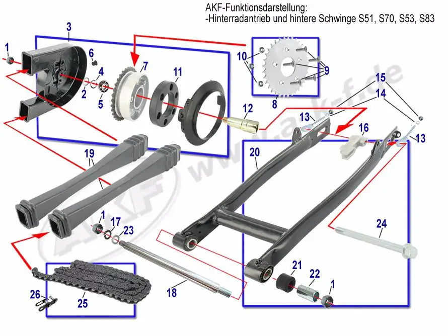 Die Scheibe im Kettenkasten ist wichtig . Sie dient dazu ,das der Bolzen nicht auf dem Schwingarm drückt.