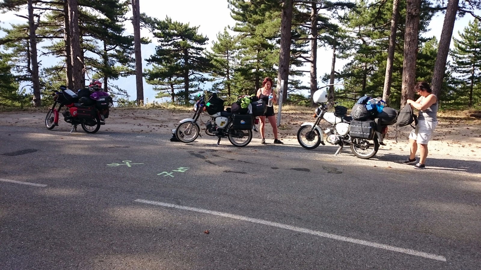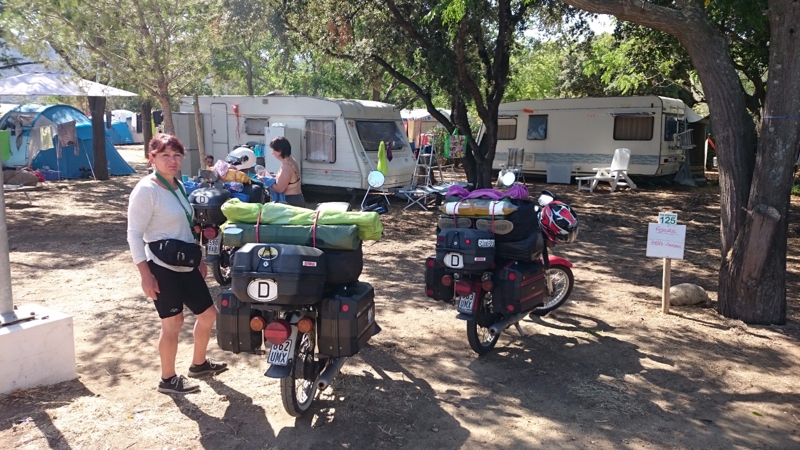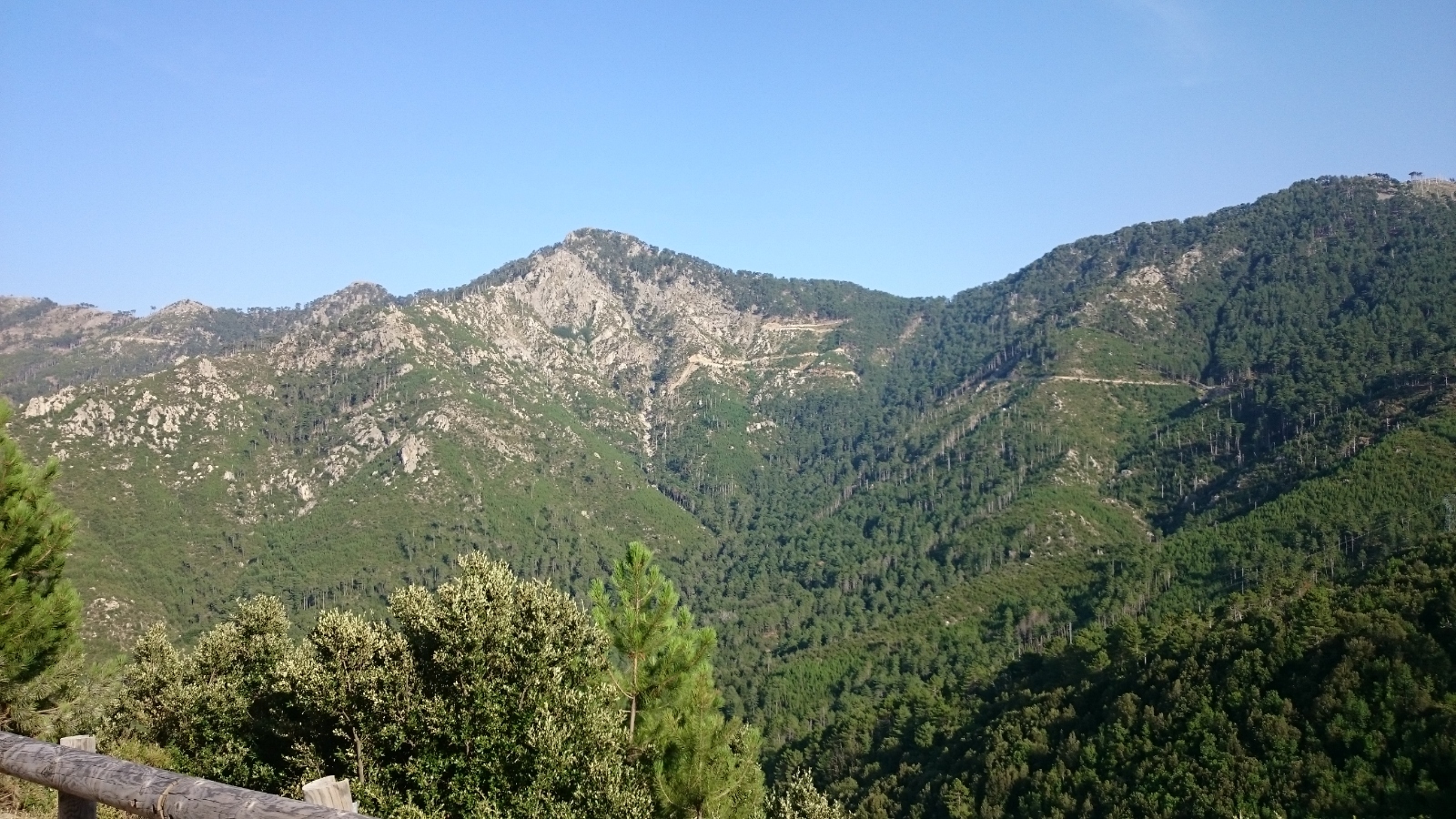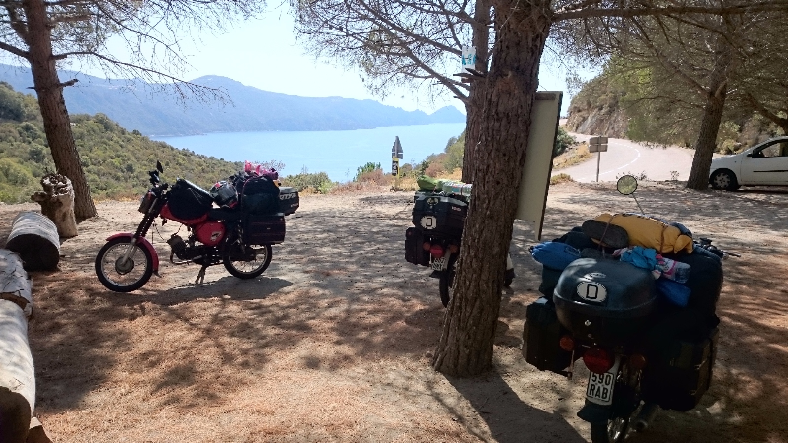 In Porto biegen wir ins Landesinnere ab. Es geht plötzlich nach einer Kreuzung steil nach oben und wir brauchen den 1. oder 2. Gang. Die Spelunca Schlucht soll mit Wasserfällen und Naturbadebecken eine Sehenswürdigkeit sein. Leider kommen wir da mit unseren Moppeds nicht ran und die 2 staubigen Zeltplätze mit sonst nix, die wir als nächstes finden, sind nicht besonders einladend. Wir fahren weiter rauf bis zum 1101 m hohen Col die Sevi. So schnell steil geht's nichtmal in den Alpen rauf. Runter laufen die Moppeds dafür wie große Motorräder.