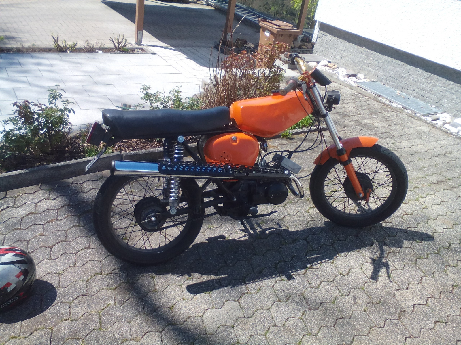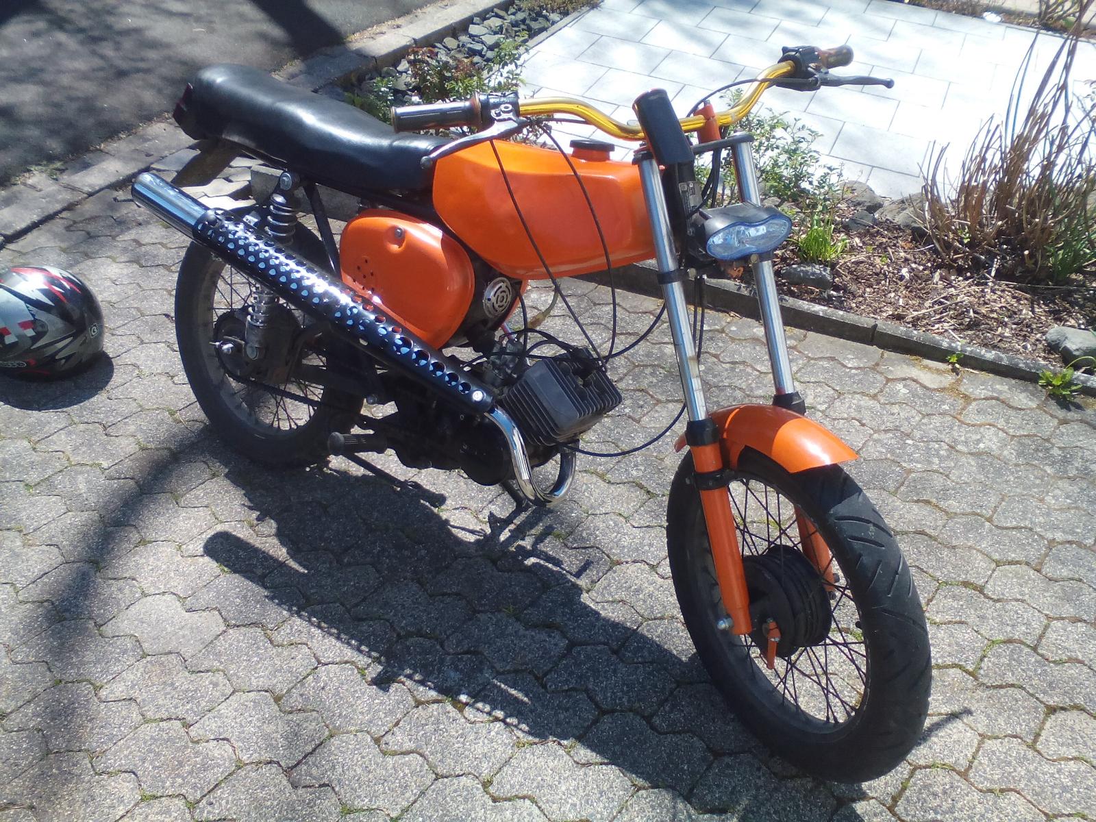 Beim Kauf war noch ein spaciges mini rücklicht ein sehr sehr kurzes heckblech und mini blinker berbaut, außerdem ein leo vince mit abe und ein 17er ritzel.