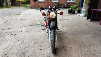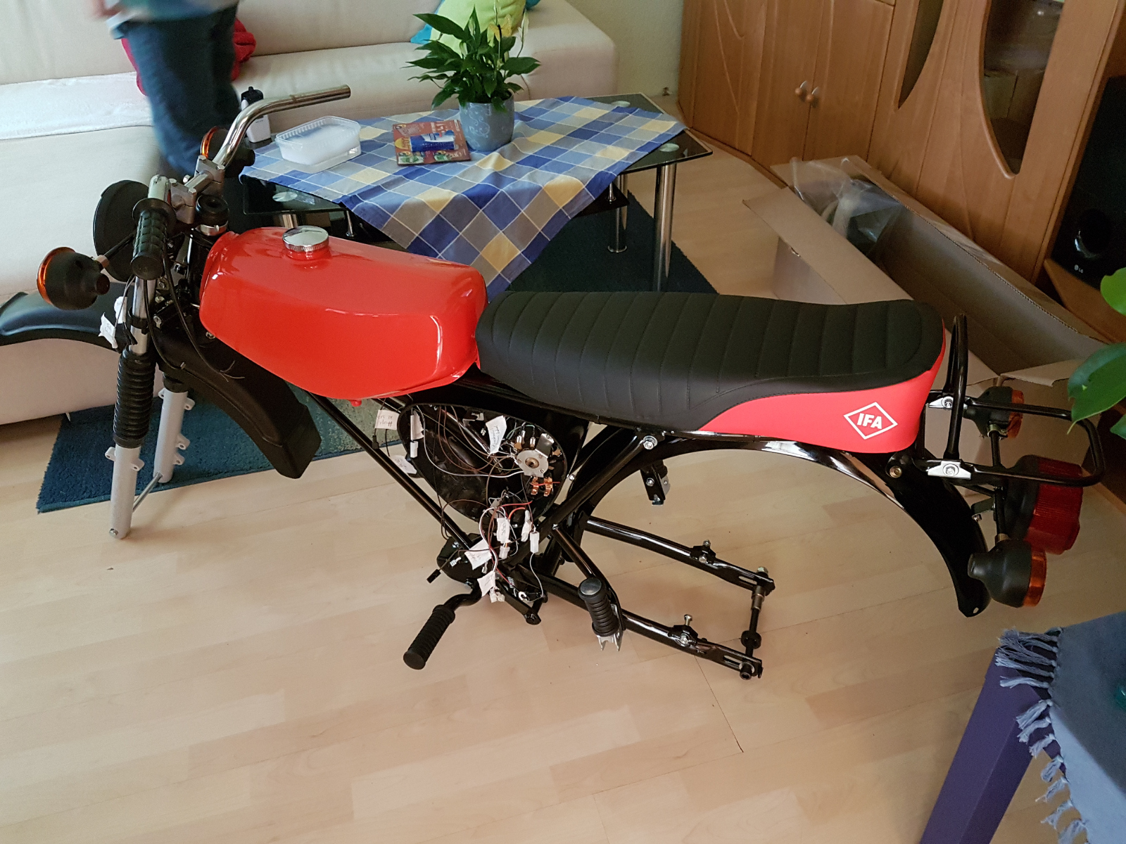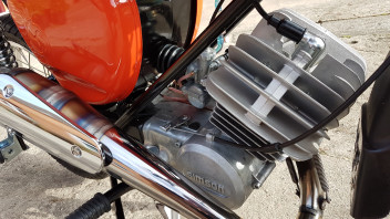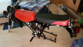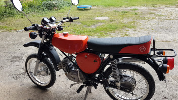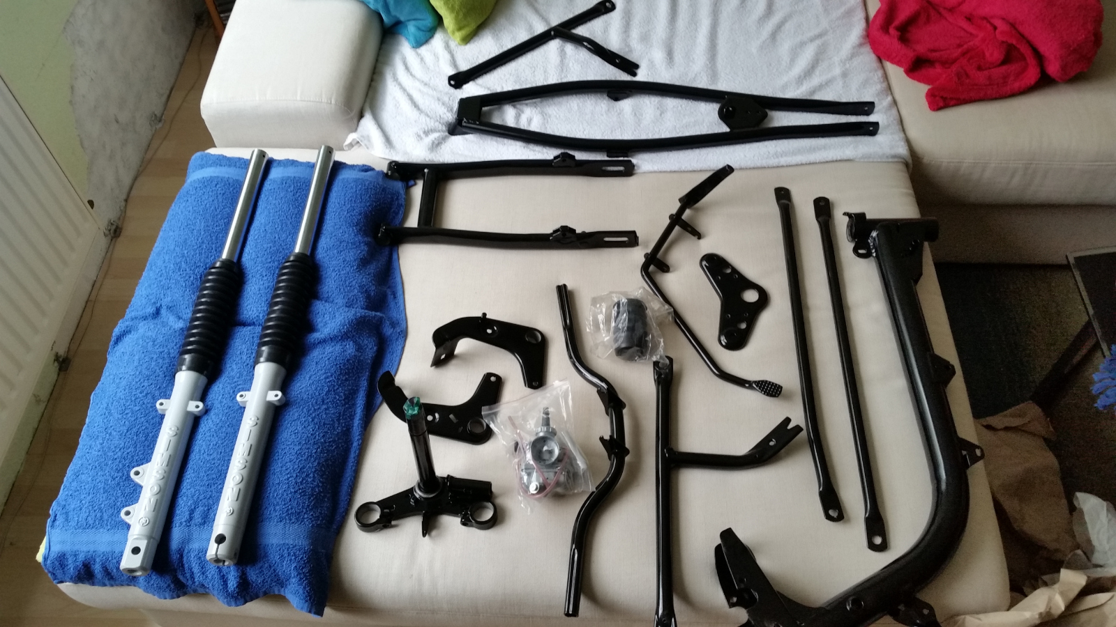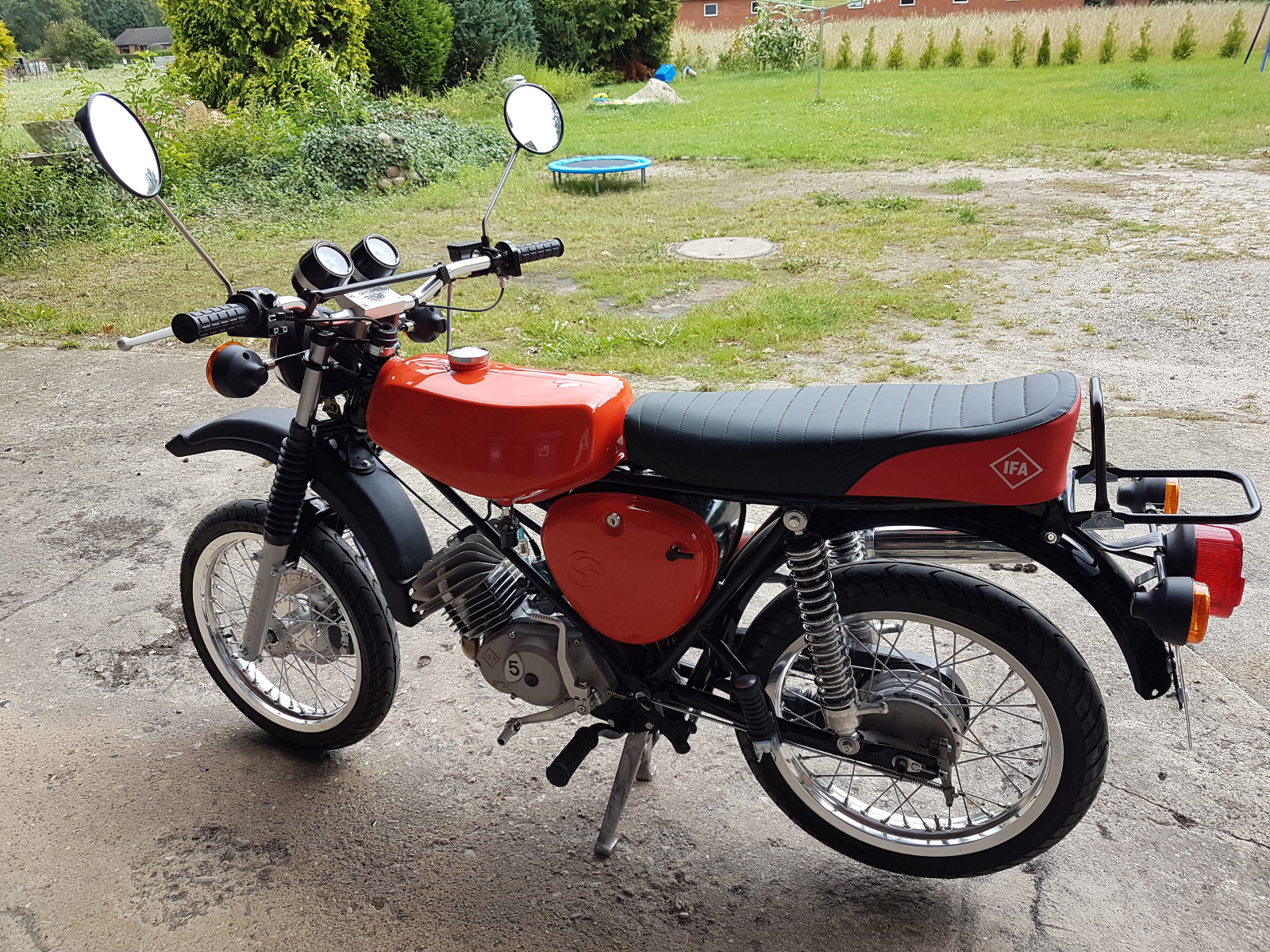 Telegabel Original S53 nagelneu wurde bestellt mit bremssattelaufnahme und von JW bearbeitet mit Öldämpfung. Bremsscheibe 220mm, Bremshebel mit Kontaktschalter, Breiter Crosslenker, Tacho und Drehzahlmesser KOSO GP Style 160Km/h und 16000U/Min, Originaler HS1 Scheinwerfer nagelneu, Zündschloss original, Kabelbaum Comfort, Kette und Mitnehmer 420er Teilung, Mitnehmer 34 Zahn MS50, Felge hinten 2.15x16 Felge vorne 1,85x16 mit Edelstahlspeichen und verstärkten Nippeln, Bereifung bis 130 Km/h zugelassen. Schwinge und Motor PU Buchsen, Enduro Klemmgabelbrücke, Unterzugstreben, Verstärkte Kettenspanner, Durchgehender verstärkter Bolzen Hinterachse mit Adapter, Hydraulisch gedämpfte Federbeine, Verstärktes Mitnehmergummi, gekapselte Radlager SKF, Kurzhubgasgriff,