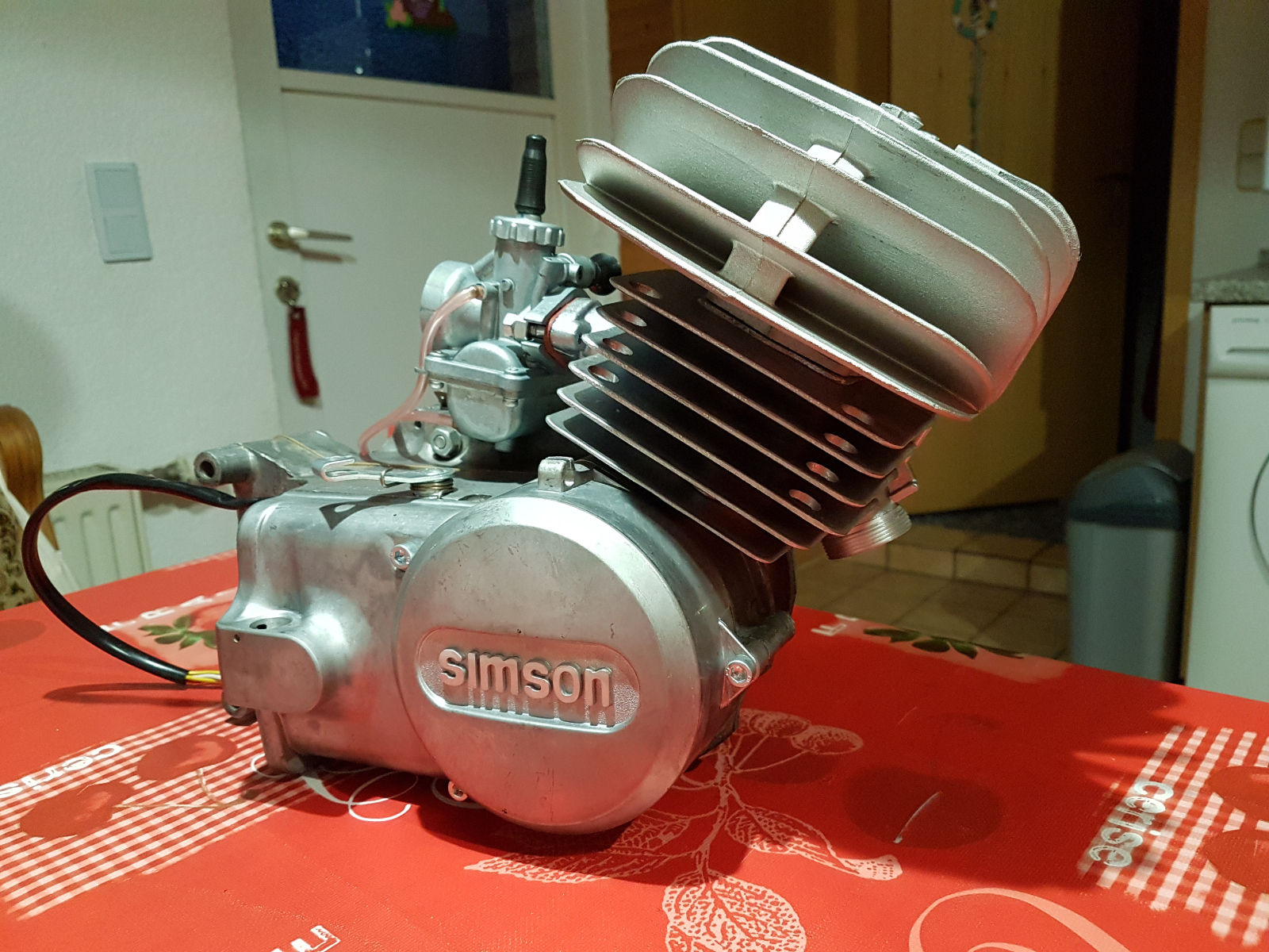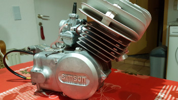 Tankset habe ich ersteigert sandstrahlen lassen Tank innen versiegelt rest lackieren lassen. Rahmenteile wurden Sand gestrahlt Grundiert und danach gepulvert in Schwarz Glanz. Dann habe ich Motor zerlegt und Motorgehäuse aufspindeln und bearbeiten lassen für langen ersten Gang sowie kanaltaschen anpassen lassen. Als das Gehäuse wieder an kam habe ich den Motor wieder zusammengebaut (alles neuteile). Ich habe eine Rennwelle untengeführt sowie SLF Lager und ein 5 Gang Getriebe von RZT Verbaut. Der Motor war fertig und ich fing an den Rahmen zusammen zu bauen der mittlererweile auch an kam. Immer wieder stöberte ich das Internet auf und ab und suchte nach verbesserungen. Einige Tage später ärgerte ich mich da ich einen Verschraubten Schaltwalzenbolzen entdeckte den ich als verbesserung sah. Aber gut dachte ich damit muss ich jetzt leben aber was war das ich entdeckte ein Getriebe mit langen ersten Gang und verstärkten 2 Gang. Also wieder ein Getriebe und diesmal auch den Verschraubten Schaltwalzenbolzen und neue Lager bestellt und Motor wieder auseinander und mit anderen Teilen Bestückt. Das erste Getriebe habe ich 2 Tage Später wieder verkauft bekommen ohne nennenswerte Verluste. Und so habe ich Monat für Monat weiter an meiner Simson rumgeschraubt alles was das Geld hergab. Aufgebaut habe ich sie im Schlafzimmer damit ich nicht frieren musste während der kalten Jahreszeit. Meine Frau war begeistert.
