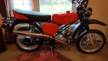 Rennwelle unten geführt, Fünf Gang Getriebe mit langem ersten Gang, verschraubter Schaltwalzenbolzen, Lagerung SLF, Schaltwalze nadelgelagert, aktuell verbaut gerade verzahnter Primärtrieb 8 Fach genietet Nadelgelagert 16:55, 5 Lamellenkupplung, Kupplungsdruckplatte nadelgelagert, 85ccm 2 kanal bearbeitet 10ps, grosser Fächerkopf, VM20 Mikuni Vergaser, Auspuff ltm85 Reso mit Kalotte, Viton Simmerringe (Doppellippe), Vape Zündanlage, Ritzel 15 Zahn 420er Teilung, Luftfilter Bearbeitet,