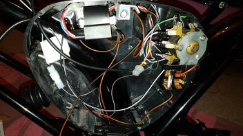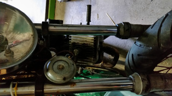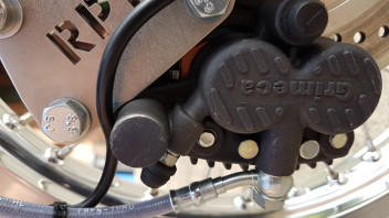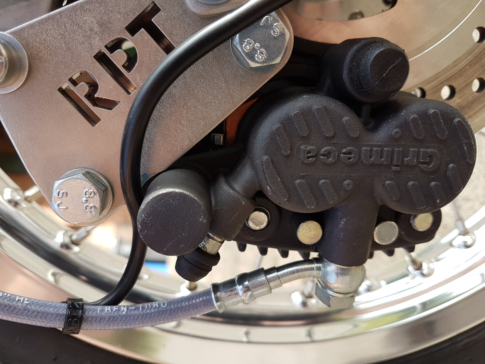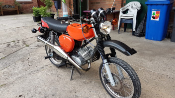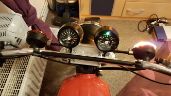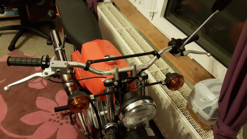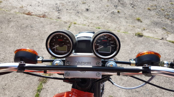 Jetzt Aktuell im August 2017 habe ich die Bremse vorne komplett demontiert und verkauft und umgebaut auf Grimeca mit Sintermetallbelägen und Stahlflexbremsleitung sowie einen gerade verzahnten 8 fach vernieteten Kupplungskorb nadelgelagert (vorher war S70 Primärübersetzung erleichtert im Einsatz). Im Juli 2017 Habe ich den Originalen Tacho und Drehzahlmesser gegen Koso GP Style getauscht.