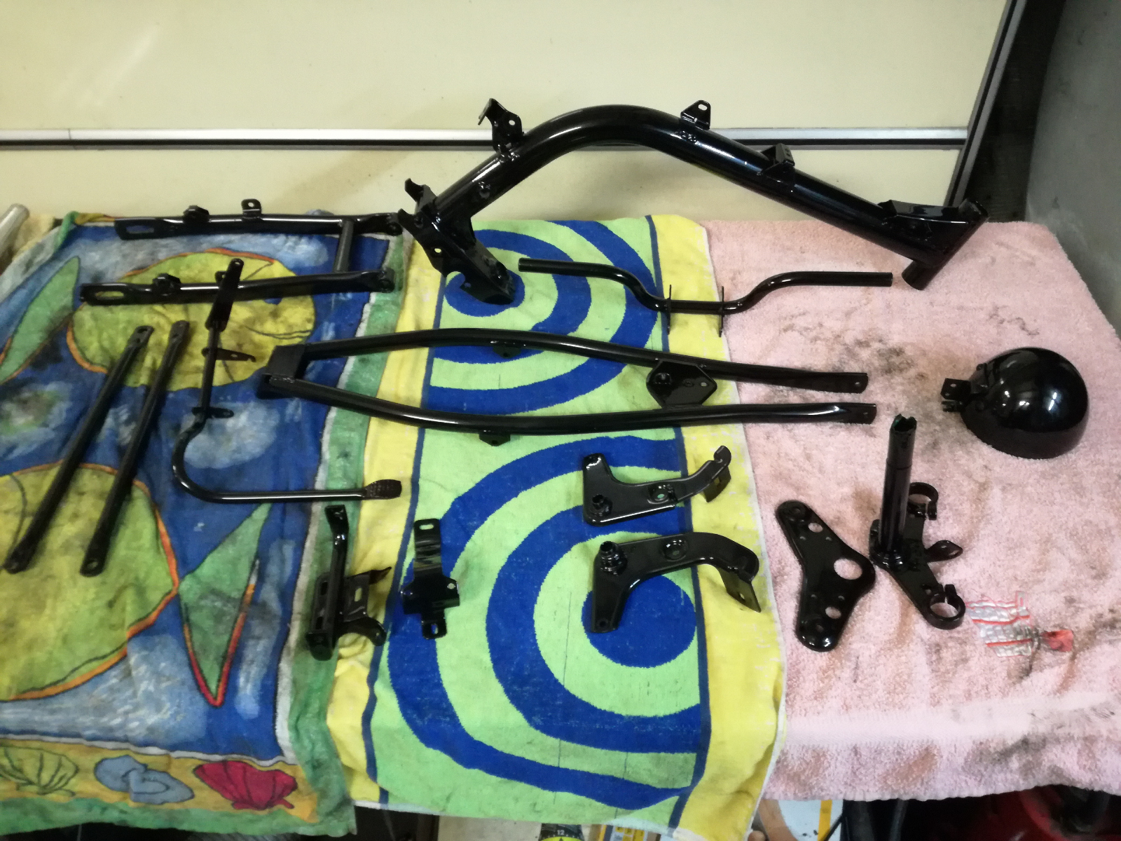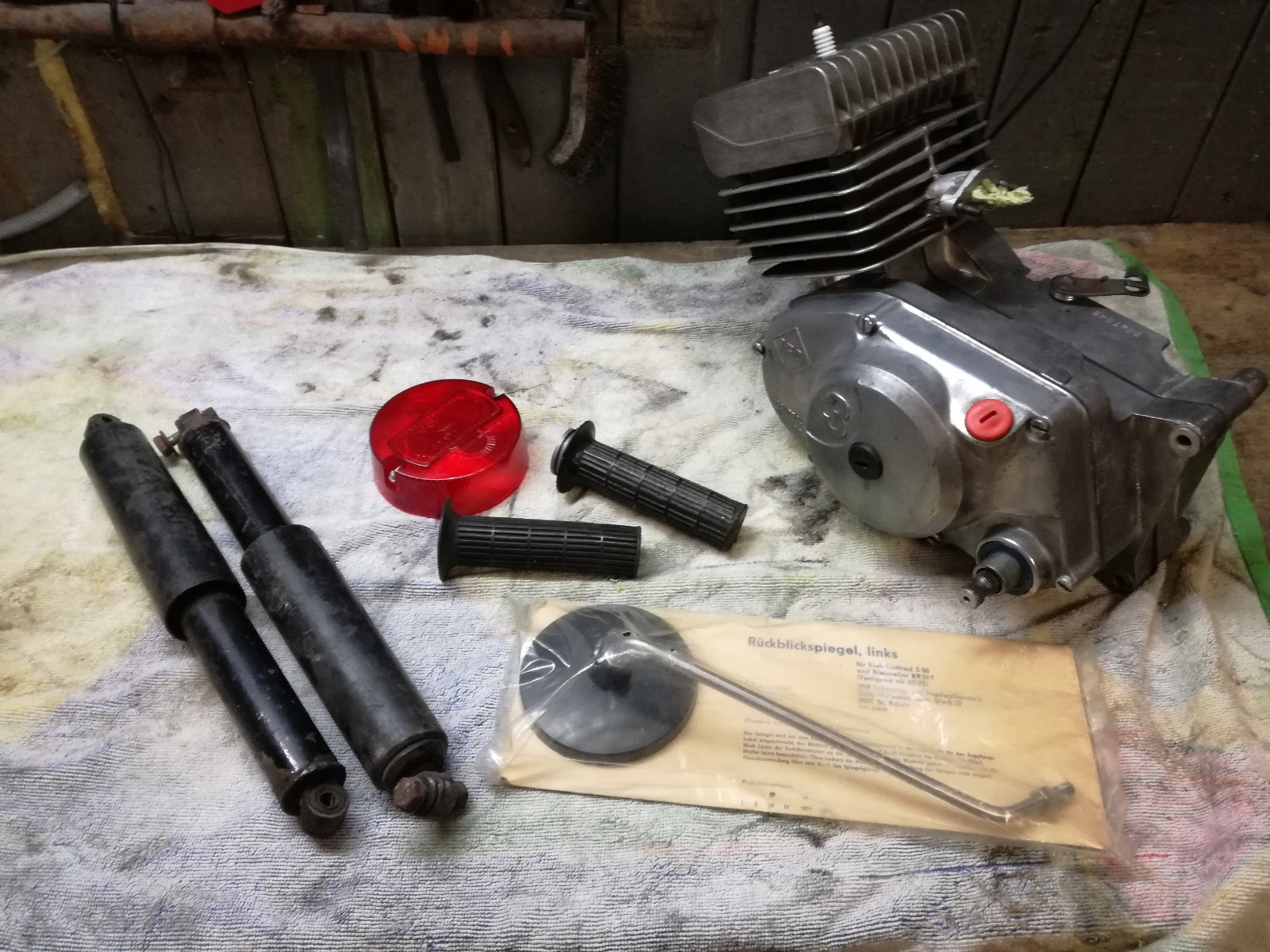 Einen schönen neuen Originalspiegel, sehr gute originale Griffgummis längst gerippt, Federbeine mit schwarzer Plastehülse und eine originale neue Rücklichtkappe. Die Federbeine muss ich jetzt noch aufarbeiten.
