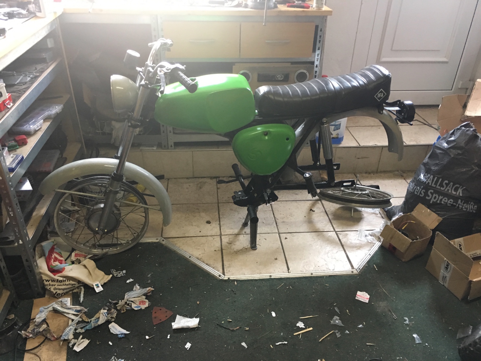 Als Dankeschön eines Freundes für das Richten eines Rahmens bekam ich einen 2. Unfallrahmen geschenkt. Aus diesem Rahmen sollte eigentlich ein Spaßmobil werden ala GP Moped, jedoch befand sich auf dem Rahmen noch ein Typenschild was den ganzen Plan über den Haufen warf.