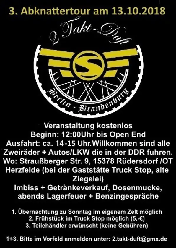 Es wird eine kleine gemeinsame Ausfahrt geben.(Start ca. um 14:00Uhr - 15:00Uhr für eine gute Stunde) Willkommen sind 2-, 3-, 4- und Mehrräder aus dem Ostblock. Natürlich sollten es hauptsächlich Simsons sein.