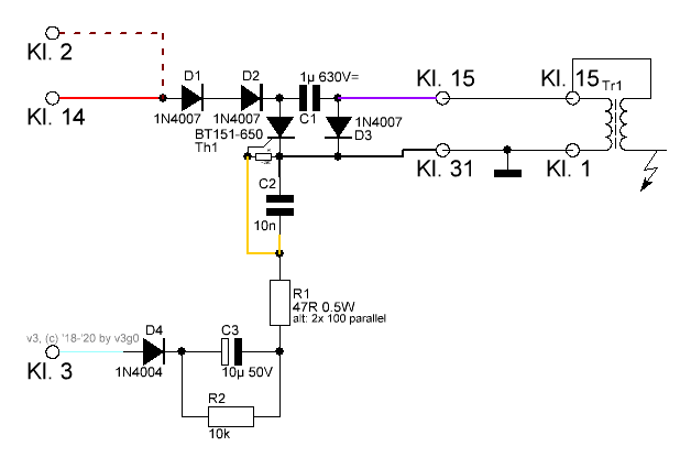 - Dioden 1 bis 3 sollten 1000V abkönnen. Man muß nicht zwingend 2 Stück am Beginn verbauen, aber es erhöht die Standsicherheit