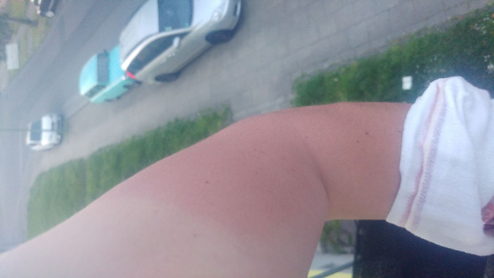 Auch daheim. Mit nem schönen Proletensonnenbrand. Hätte auch drauf kommen können, dass die Sonne pausenlos durchs Fahrerfenster knallt wenn ich gen Westen fahre