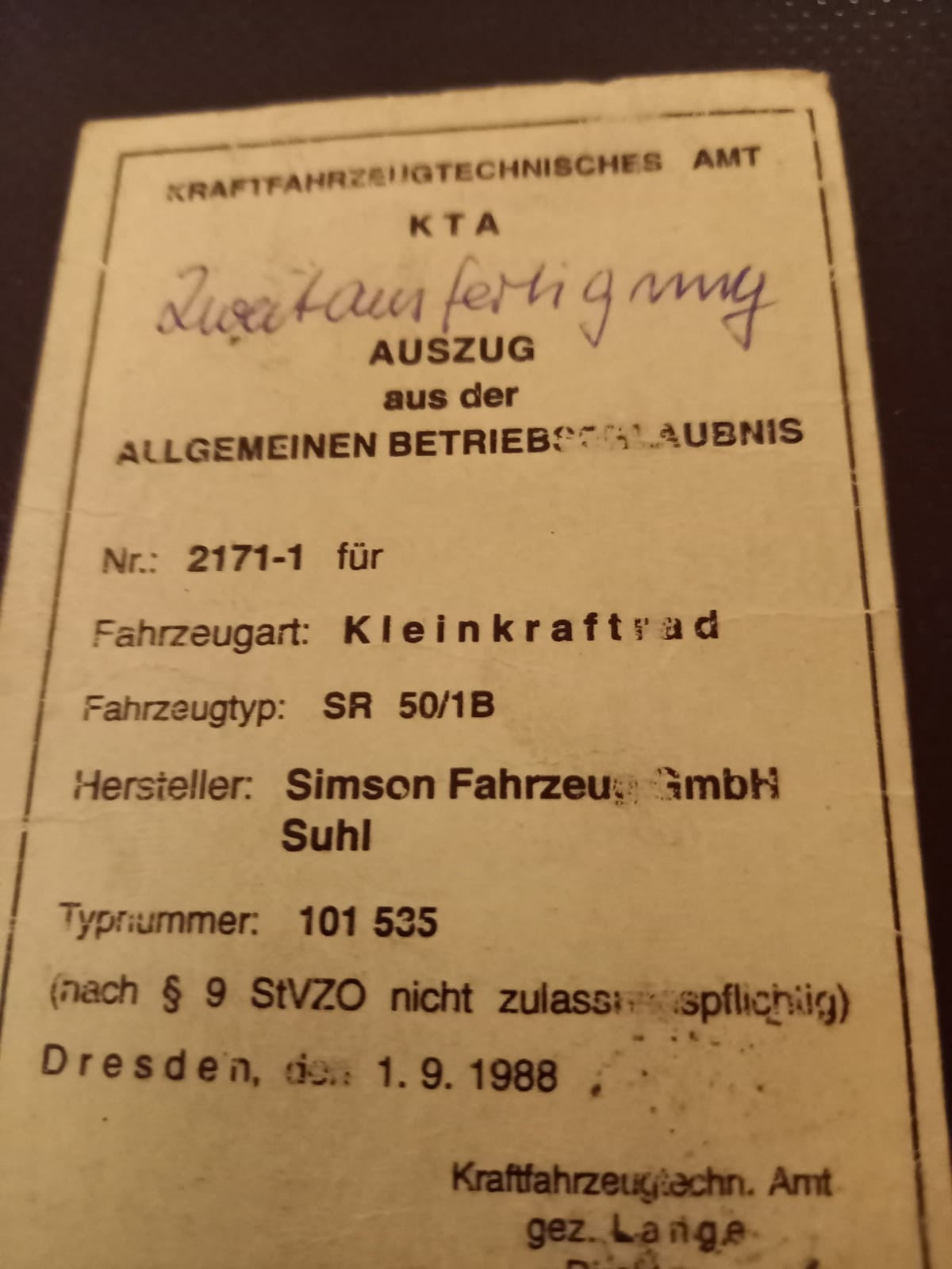 Die ABE hat ausserdem einen Stempel der Simson Zweirad GmbH in Suhl.