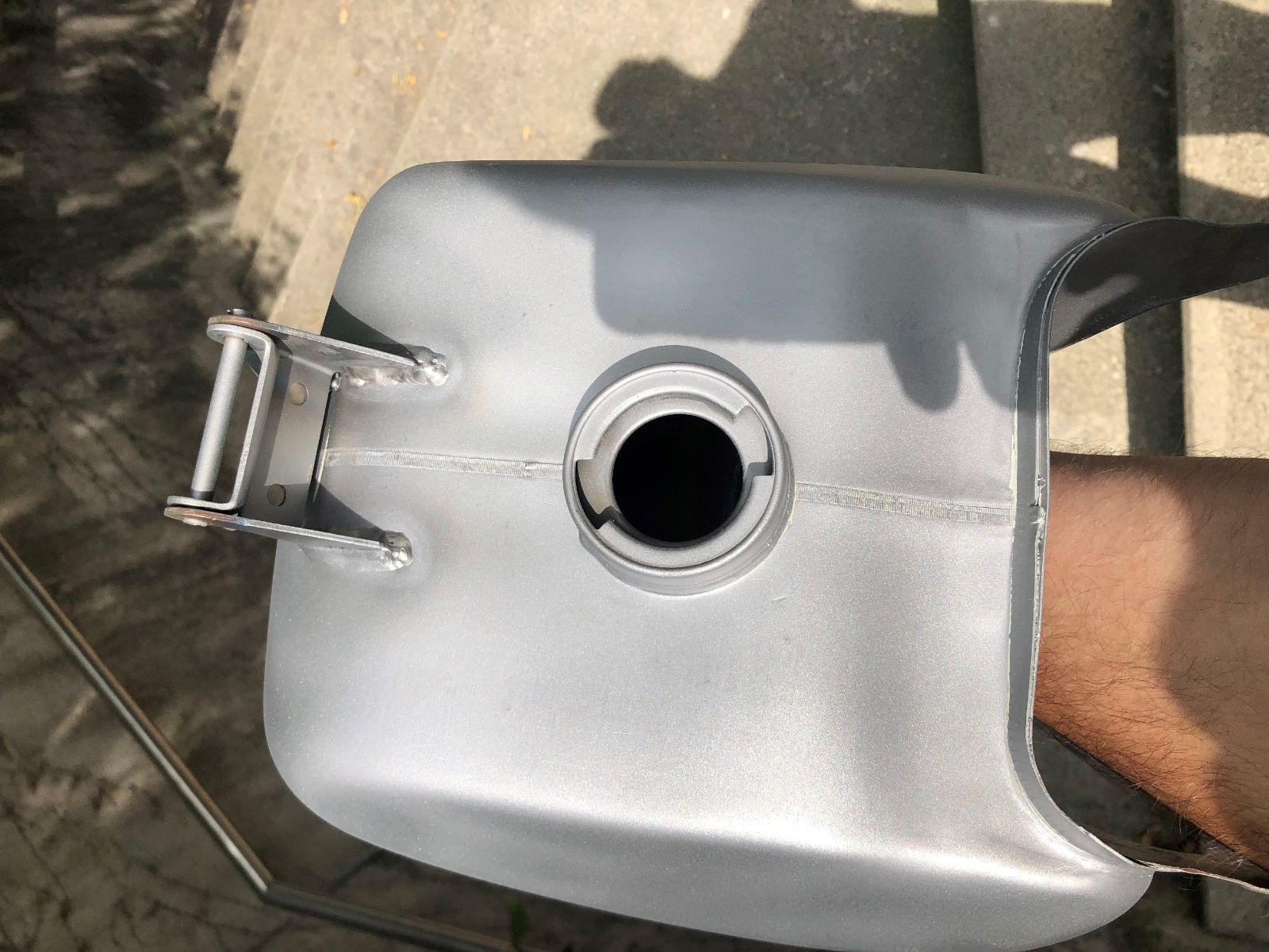 Es ging mal wieder etwas weiter....Tank hab ich Glasperlgestrahlt und ein Freund hat ihn am Scharnier noch richtig geschweißt das da nix mehr einreißen kann bzw sollte. Teile trudeln nach und nach ein...einen Auspuff vom Bekannten abgekauft... der wurde von JW Sport gefertigt. Jetzt den Motor mal regenerieren lassen Teile zum Pulvern dann kann der Zusammenbau beginnen