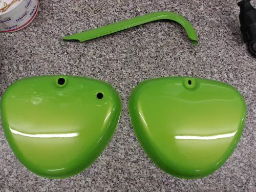 Tank und Seitendeckel bekam ich amFreitag zurück und bin mit den Ergebnis sehr zufrieden. Der Lack geht in der Sonne mehr ins gelbliche und an Falkes wurde auch nicht gespart.