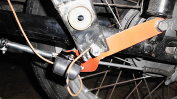 Einfach vom alten Kontakt an der Hinterradbremse das Massekabel entfernen. Am Zugschalter sind zwei Kontakt, in die man Kabel einstecken kann. Am rechten Kontakt habe ich einfach ein Kabel am Rahmen befestigt, sodass ich Masse habe. Am linken Kontakt einfach das Massekabel an die Lüsterklemme packen, an der auch die anderen Kabel für das Rücklicht sind.
