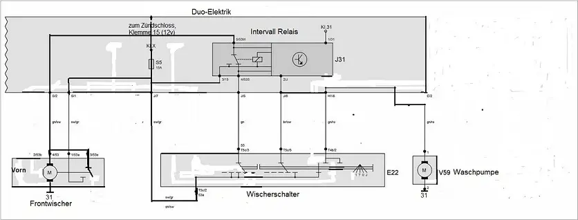 folgendes Ergebniss: Relais hat 5 Anschlüsse: 1.) Nr.15=> vom Zündschloss kommend, 2.) Nr.31=> zur Masse), 3.) Nr.53c=> 1. Schaltstellung vom Wischerschalter, Dauer-ein), 4.) Nr.53e=> zum Wisch-Motor, (vorher vom Schalter kommend), 5.) Nr. I=> (Intervall-Impuls) 2. Schaltstellung vom Wischerschalter).