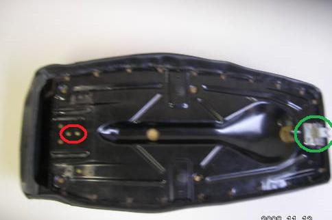 Bei meiner jetzigen Sitzbank an ner SR50 hat man vorne das Scharnier für den Klappmechanismus. Die zwei Schrauben dafür sind in die das Bodenblech der Sitzbank reingeschraubt. Kann man mit nem 10er-Schlüssel rausdrehen.