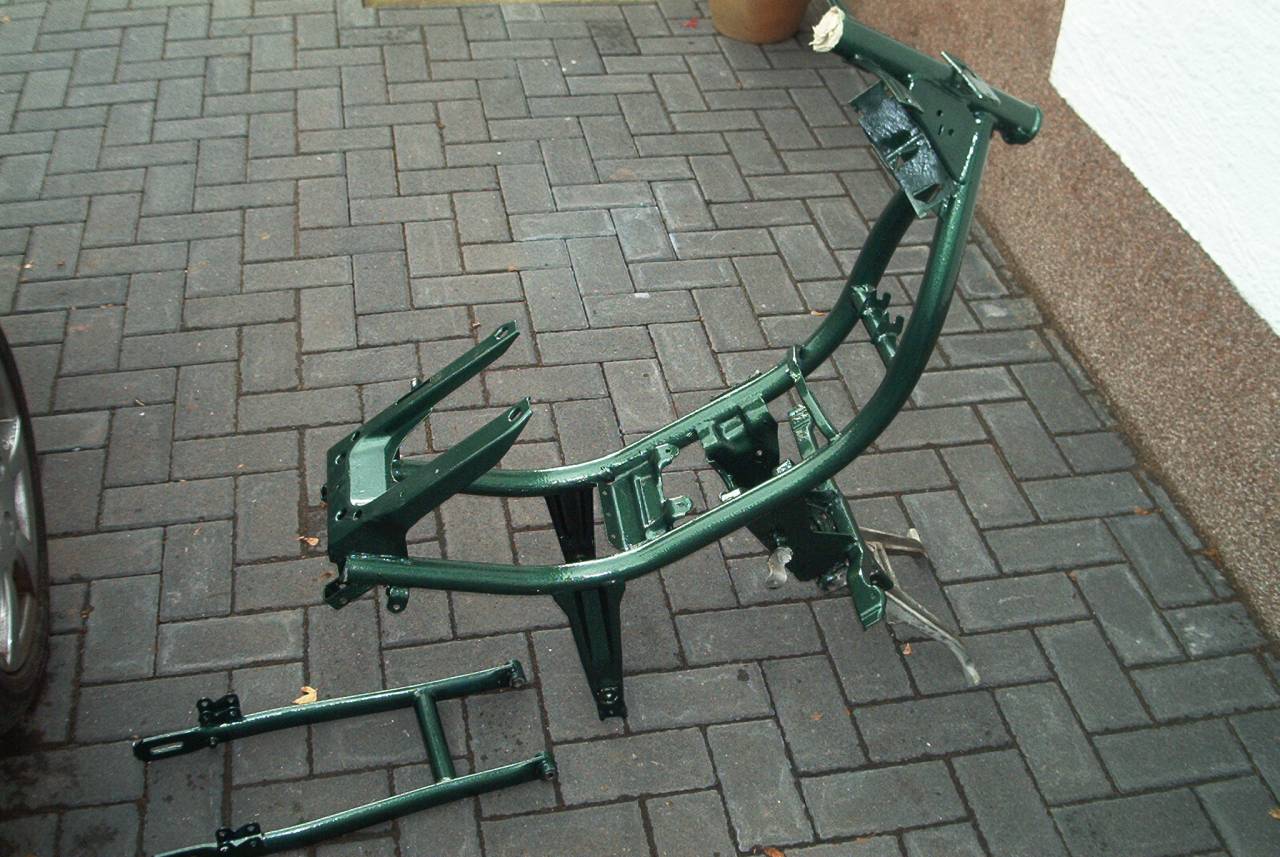 so nun der rahmen , gesandstrahlt, grundiert , und in hammerschlag grün lackiert .