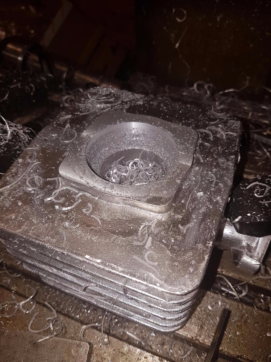 Obere Planfläche fräsen, Bohrung auskreiseln und spindeln, dann die Bohrungen 50x50. Diese habe ich auch kleiner gewählt. 6,2mm habe ich sie gebohrt, anstatt wie in den ganzen KK 7-7,3mm
