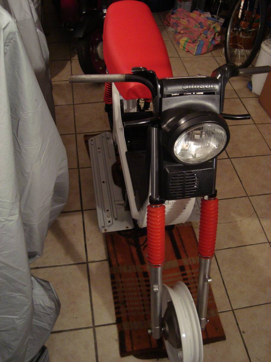 - rote Marzocchi Faltenbälge vorneDa ich aber zu dem Zeitpunkt noch andere Projekte und Aufträge zu laufen hatte, kam der SR-E erst mal abgedeckt in die Ecke.