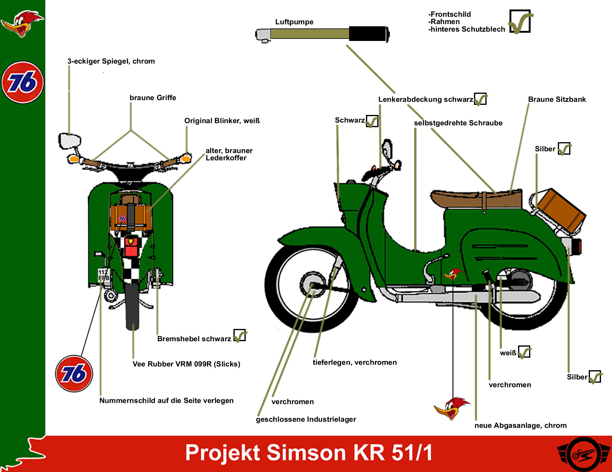 Aber optisch find ich teilweise die Simmen extrem verbaut. Siehe den SR50 (\"Blue Evil\" hier aus dem Forum), das find ich muss nicht sein. Aber es bleibt jedem selbst überlassen. Finde original Maschinen auch schöner, aber kleine Veränderungen sind schon ok. Will meine Schwalbe (Projekt KR 51) auch tieferlegen und diverse Teile verändern. Man sollte nur noch erkennen können, dass es eine Simson ist. Ich kenne ein Haufen Plastikbomberpiloten, die denken, nur weil sie nen neuen Auspuff dran hängen, würde ihre Kiste mehr laufen und könnten mich ziehen. Falsch gelegen, mit nem Plastebomber, der von der Leistung her noch original ist, hat keine Chance gegen eine original Simme und gegen eine getunte sowieso nicht. -