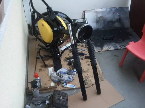 dann habe ich heute die telegabel auseinander genommen und die gleitrohre zum pulvern gebracht wenn ich se schon machen muss dann kann ich se auch gleich richtig machen.dann habe ich heute mal geschaut und das moped ist defenitv nach einem unfall wieder zusammengeschustert wurden was mir dann verschwiegen worden ist naja für 150€ ist es dann auch egal und jetzt wirds eh neu gemacht.