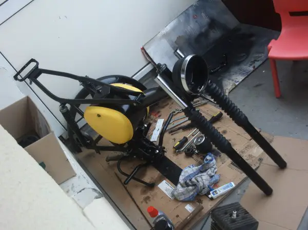 so heute sind die ersten neu bestellten teile gekommen und dan kann es auch bald weiter gehen sowie die restlichen teile vom pulvern wieder da sind. dann wird die Telegabel wieder fit gemacht und verbaut.Nächste woche fang ich dann an mit der Elektronik und wenn das dann alles ok ist sollte es ohl kein ding sein und so mitte bis ende Aprill sollte dann auch schon gefahren werden aber mal abwarten was noch so alles kommt. werde wohl den schwingenbolzen auch noch mal tauschen der alte gfällt mir nicht und die gewinde sind alle mit zange und hammer verkantet worden, hab den jetzt erst mal drinnen wird aber noch mal getauscht.
