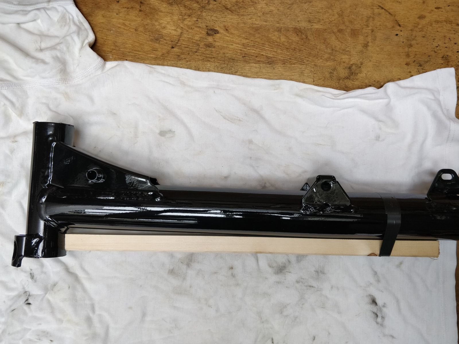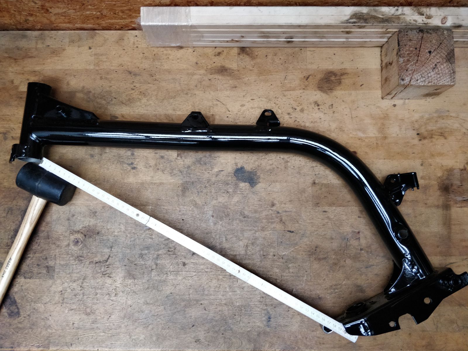 So gestern den Rahmen vom Pulverbeschichten abgeholt, dabei ist mir aufgefallen dass das Hauptrohr leicht nach oben geht. Also direkt mal nachgemessen. Fragt nicht warum ich das nicht vorher gemacht hab