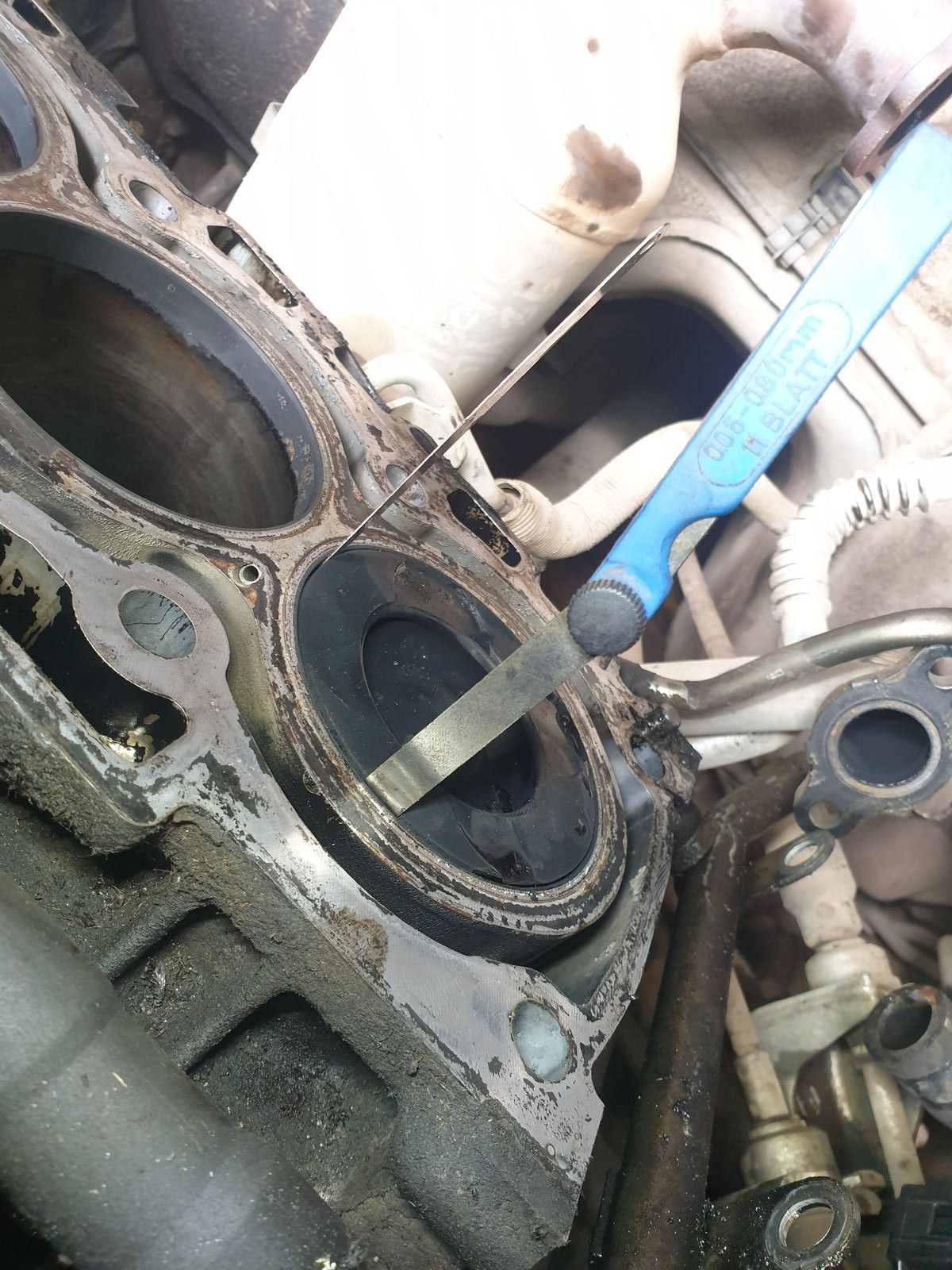 Na dann lohnt sich Kopfdichtung machen nur bedingt, aber wenn die Kurbelwelle noch taugt weil die Lagerschalen noch sauber tragen, Block aufs nächste Maß bohren und hohen und neue Kolben rein. Muss man schauen ob es bei den Fahrzeug noch wirtschaftlich ist.