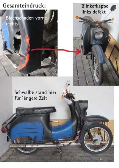 Allerdings habe ich bisher nicht erwähnt, dass in der Garage vor einiger Zeit ein paar Steine geflext wurden -- seitdem liegt auf der Schwalbe zentimeterdick Staub. Soooo schlecht wie auf den Bildern sieht sie nun auch wieder nicht aus ![]()