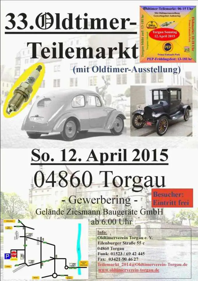 Der Oldtimerverein Torgau e. V. veranstaltet am Sonntag, dem 12. April 2015 wieder den nun schon traditionellen Torgauer T e i l e m a r k t. (im Länderdreieck Sachsen - Brandenburg - Sachsen-Anhalt). Dort wird alles angeboten, was mit dem Oldtimerwesen zu tun hat. Veranstaltungsort ist wie bisher das Gelände der Torgauer Firma „ZIESMANN Baugeräte GmbH Vermietung, Verkauf und Service“ im Gewerbegebiet Außenring Torgau, Gewerbering Nr. 14, ausreichend Hinweisschilder an den Zufahrtsstraßen sind vorhanden. Beginn ist am Sonntagmorgen um 6.00 Uhr und der Markt wird bis ca. 15.00 Uhr für Besucher und Händler geöffnet sein. Selbstverständlich ist auch für das leibliche Wohl aller Beteiligten und Besucher bestens gesorgt.