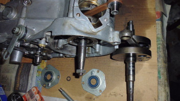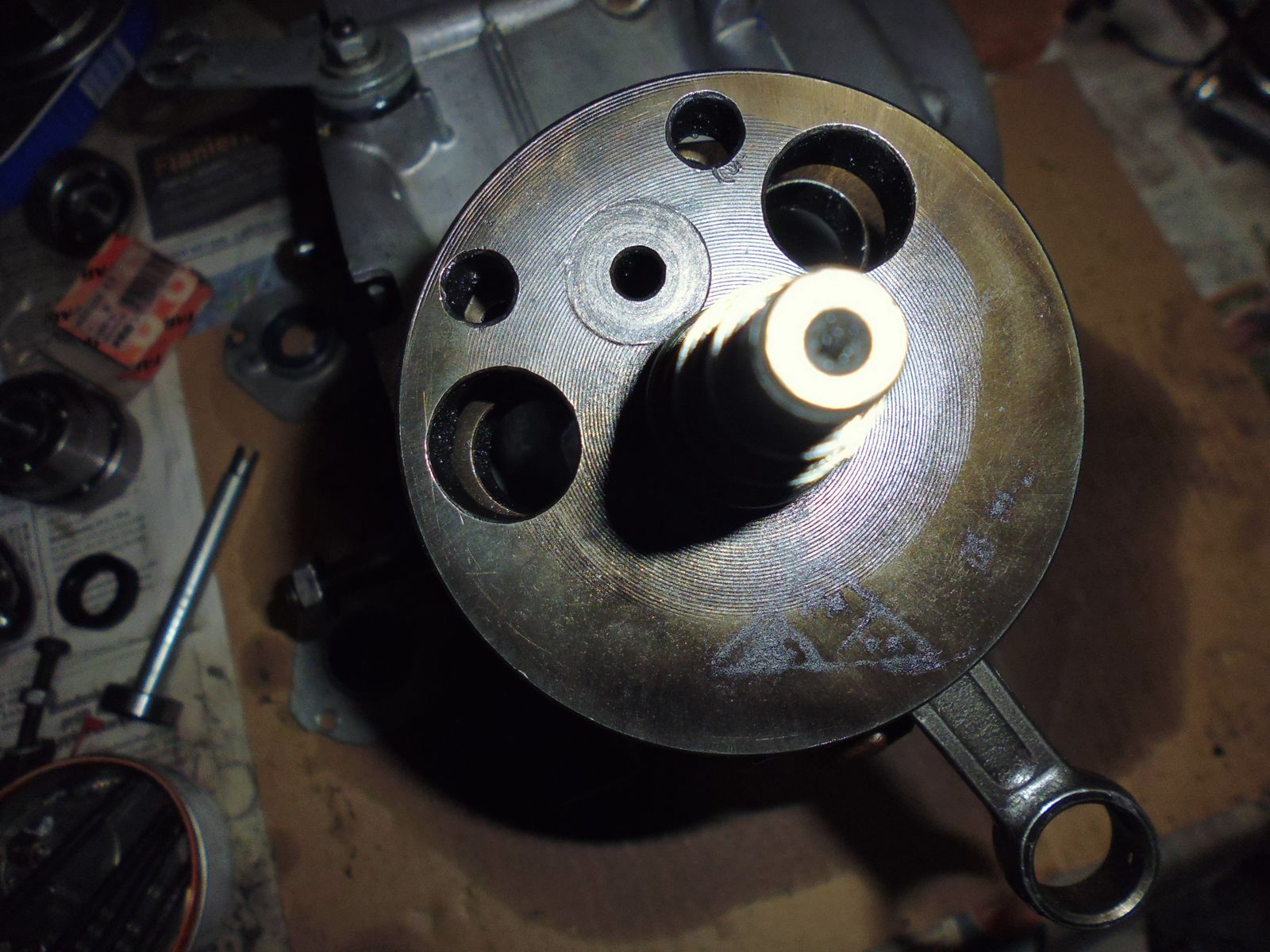 Um nun ersterem entgegenzuwirken, habe ich einen alten Motor (seit 20 Jahren war er im unangetasteten Fundus im Keller, damals gabs die Dinger, "konserviert" unter einer öligen Kruste aus Öl, Erde und Gras für ganz kleines Geld) regeneriert, und die (Austausch-) Kurbelwelle ausgewuchtet (mit Not und Mühe um ca.21g erleichtert, Bohren geht kaum, die ist hart), und gerichtet.