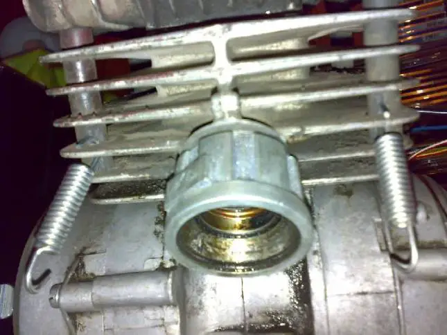 ich hab auf den krümmer einen massiv kupferring geschoben (geht schwer, weil die biegung nicht 100% ist, man kann auch einen normalen breit quetschen (ca 1mm hoch)), dann den kugelflansch hinterher, hält wunderbar. foto kann ich machen, da sieht ma allerdings den dichtsring nicht. das system dichtet sich nach paar km von selbst ab, am anfang blubbert es noch vorn raus. die dämpfungsgummis am zylinder hab ich bissl bearbeitet, damit sie an den federn vorbeipassen, die habe ich dort mit ins loch gehängt. foto kommt heute abend! -
