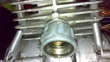 Ich habe diesem Beitrag drei Fotos angehängt. Dort ist zu sehen: Auf den Krümmer habe ich einen Massivdichtring aus Kupfer geschoben, dahinter den Flansch. Geht bissl hakelig um die Kurven, aber geht. Am Zylinder habe ich die beiden vorderen Dämpfungsgummis herausgenommen, die Federn eingehängt und die Dämpfungsgummis so lange bearbeitet bis sie problemlos an den Federn vorbei sich wieder einsetzen ließen. In der Kalotte, die auf das Gewinde am Zylinder geschraubt ist, ist kein Dichtring dabei, dieser muss extra bestellt werden (zumindest bei AKF). Diesen einfach in die Nut einsetzen. In die Kalotte habe ich einen Massivdichtring und einen zum Quetschen zum Abdichten reingelegt und dann die Kalotte auf das Gewinde aufgeschraubt. Festziehen geht mit dem Hakenschlüssel, der auch bei der normalen Mutter passt. Jetzt kommt die Kür die Federn in den Flansch einzuhängen. Am besten hat es bei mir geklappt, als ich nur den Krümmer genommen habe (ohne Auspuffrohr, das lässt sich später montieren, wenn der Krümmer sitzt). Ich habe den Krümmer in die Nut in der Kalotte gesetzt und eine Seite (Fahrtrichtung links) in die Feder eingehängt. MIt einer Hand halte ich den Krümmer fest, in der anderen halte ich einen Schlitzschraubenzieher, möglichst lang!! Vorne den Schlitz setze ich ans Loch wo die Feder am Kugelflansch reinschnappen soll. DIe Feder hänge ich weiter oben am Schraubenzieher ein. Ein gezielter Ruck und die Feder rutscht über den Schraubenzieher ins Loch. Die Feder kann am Zylinder nicht ausschnappen, allerdings trotzdem aufpassen mit den Fingern. Nach 2 MInuten Training war der erste Versuch geglückt. Man wird schneller