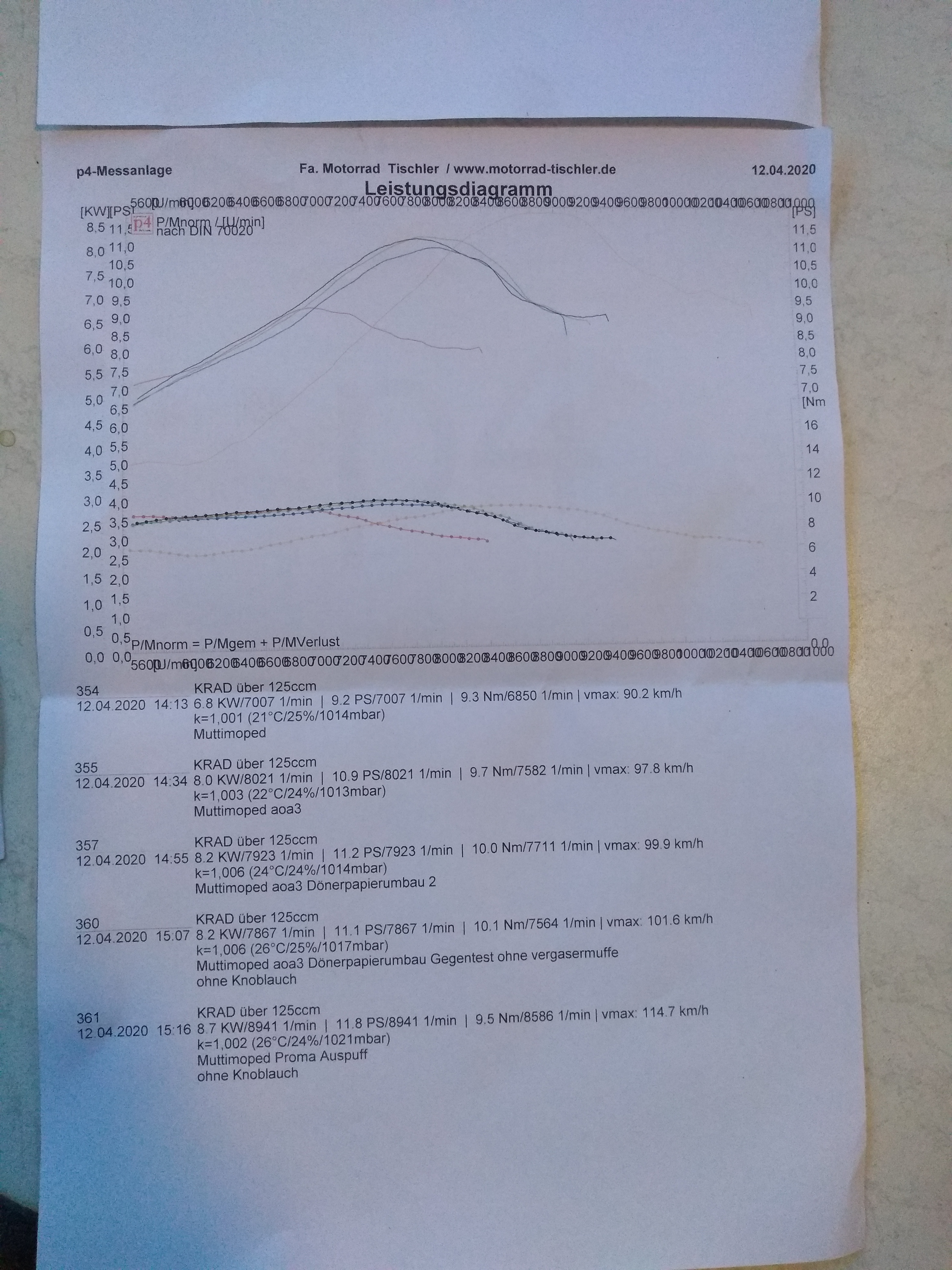 Weiterhin wurden noch andere Auspuffe getestet: AOA3 (32er Krümmer), AOA3 Umbau auf Dönerpapier