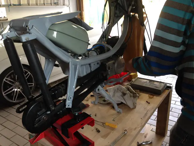 Der Rest sieht soweit sehr gut aus. Sogar die original Sitzbank ist noch drauf (ohne Risse). Das hat man selten. Ein wenig habe ich auch schon gewartet und getauscht mit Teilen die ich hier noch rumliegen habe. Der größte Teil war wohl der Motor den ich gegen einen frisch regenerierten 4Gang Motor getauscht habe den ich hier rumliegen hatte.