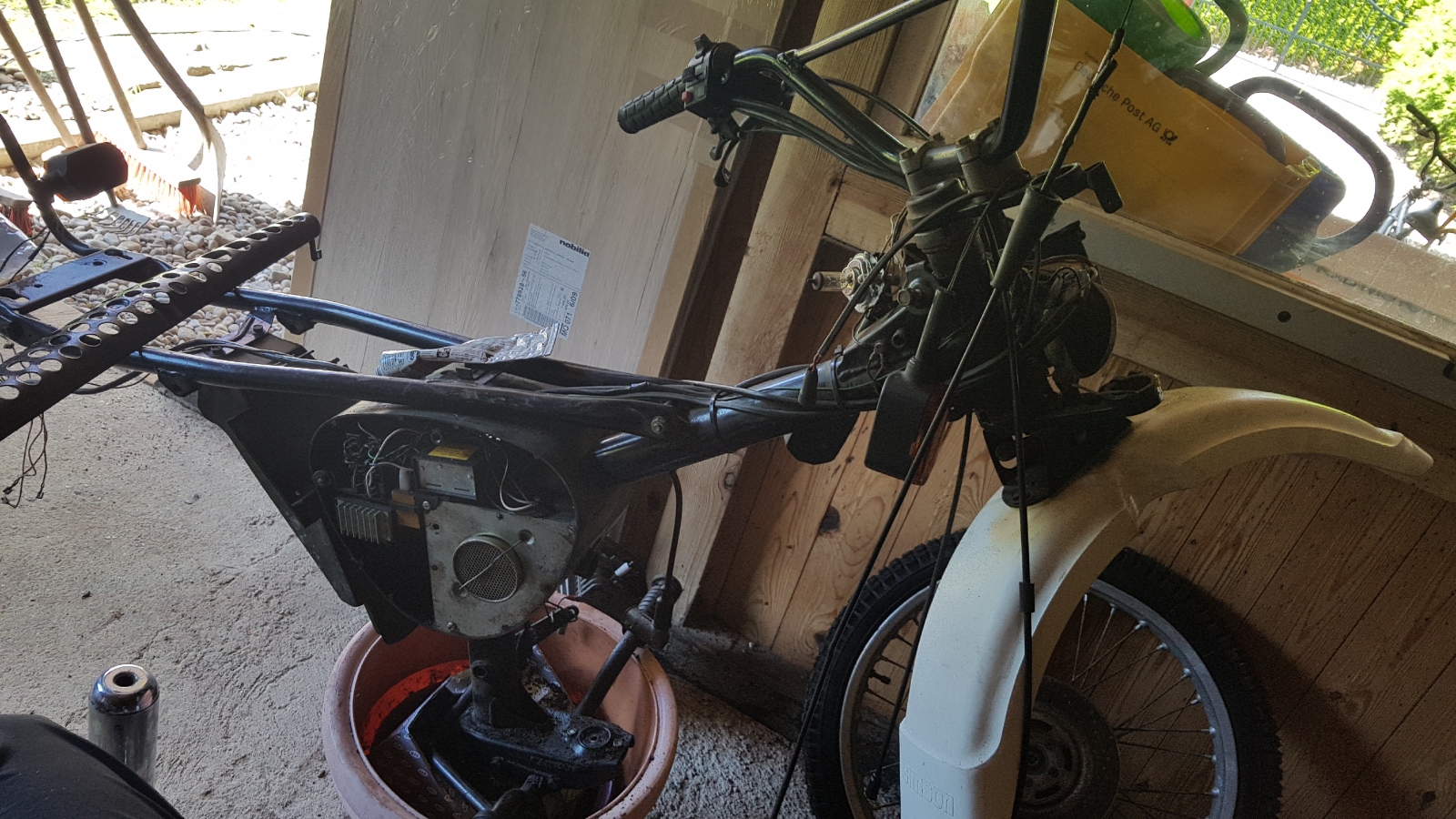So sah das Moped nach dem Kauf auf meinem Hof aus. Jetzt könnte man sagen das sie ja fast fertig ist, aber der Filter auf dem Bild täuscht.