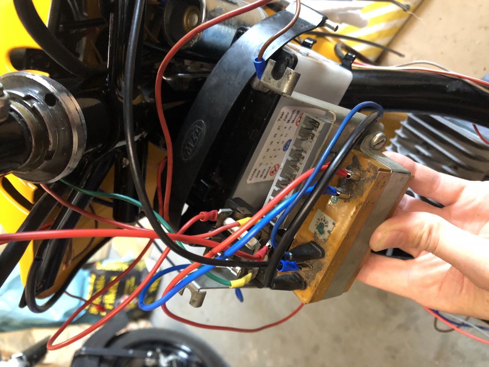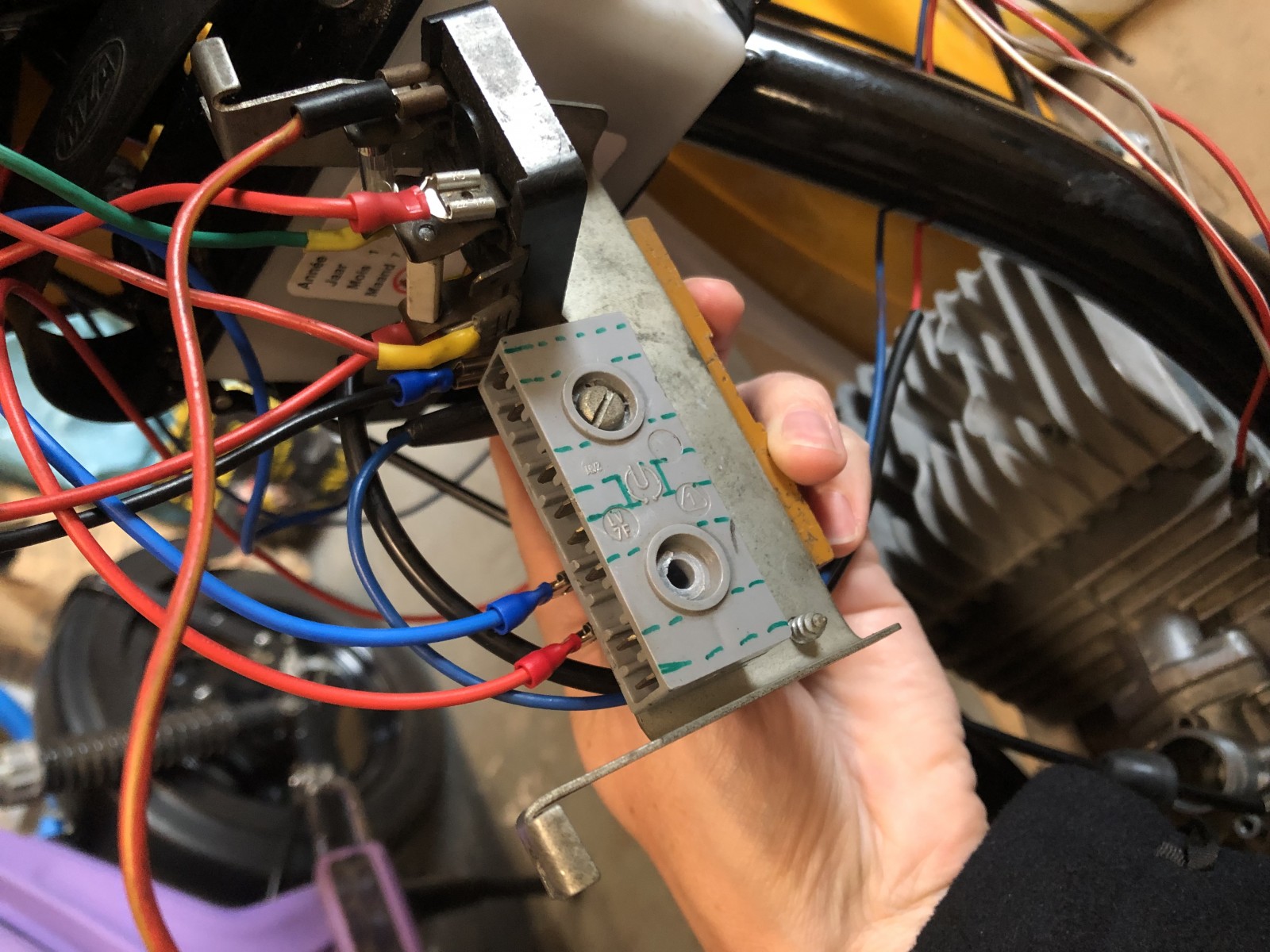 Wenn ich mit einer Prüflampe die vier Stromführende Kabel von der Grundplatte im Motor prüfe, also Kerze raus und am Kickstarter klicke, hat das weiße und das rote keinen Strom (Prüflampe aus). Die anderen beiden - gelb und gelb/rot haben Strom.