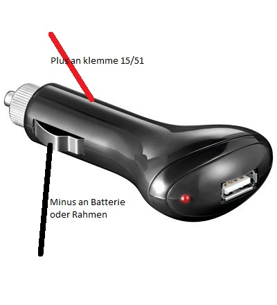 Kann man nicht einfach ein normales Zigaretten-USBstecker nehmen und einfach 2 Kabel anlöten (+ & -) .