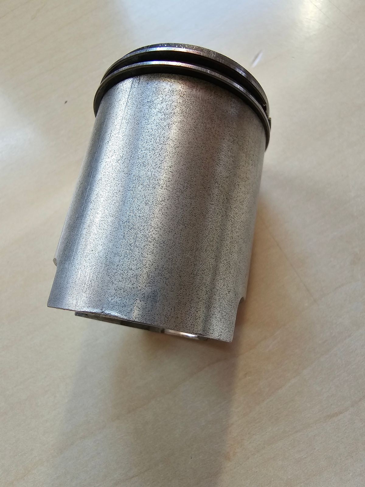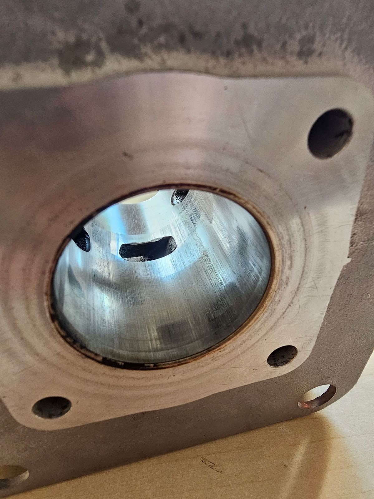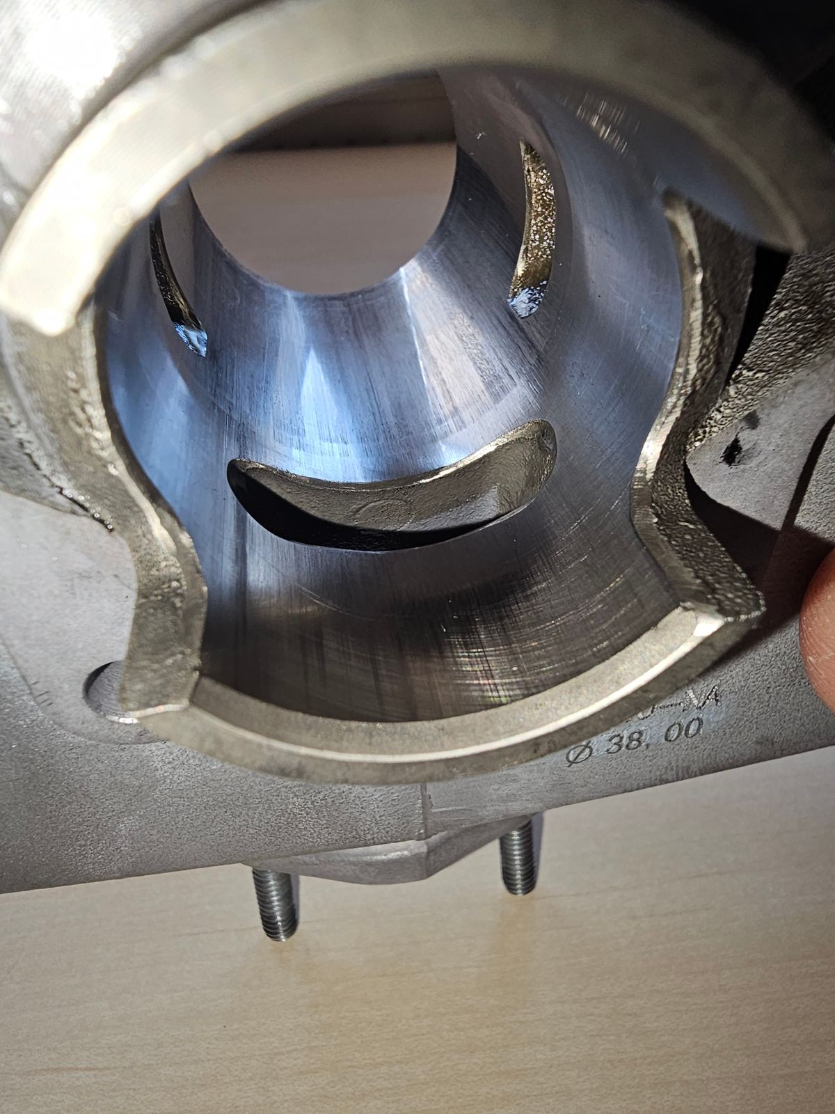 So sieht das ganze jetzt aus, der Kolben hat Einlaßseitig feine Kratzer. Der Zylinder hat leicht raue Schlieren, aber keine Riefen.