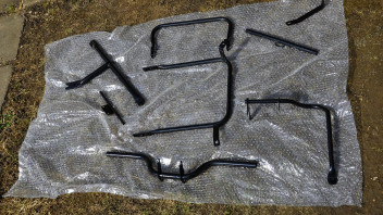 Alles klappte saugend, die Teile paßten, sehen schick aus und auch das rostfreie Schraubenzeug hatte ich in ausreichender Quantität zur Hand. Nur war da ein Moment, an dem drei Fragezeichen über meinem Haupte im Sonnenlicht tantzten. Im Ständer befindet sich oben ein Rohrstück mit Buchsenfunktion, welches dafür da ist, daß nach dem kräftigen Anziehen der Ständerbefestigungsmutter der Ständer sich noch leichtgängig bewegen läßt. So ist auch bei der Fußbremsgestängebefestigung eine Buchse im Rohr. Diese nun nahm ich heraus (nochmals herzlichen Dank an Zehkich, der mir das empfahl - hättest Du mich nicht darauf hingewiesen, hätte ich sie übersehen und alles so zusammengebaut) entrostete sie gründlich und fettete alles ordentlich ein mit "Sovisco C Gerätefett LAI + h2 (2/36)" aus dem "VEB (Volkseigenen Betrieb) Technische Wachse Jena", wovon eine Einkilodose seit einer Betriebsbesichtigung meinerseits Mitte der Neunziger Jahre die Ausrüstung meiner Bastelgaragen komplettiert und begleitet.