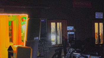Hier hielt ich mich rechts und fuhr den sanften Wanderweg hinunter nach Niederlichtenwalde. Das erste Gebäude, wenn man in das Dorf hineinkommt, ist eine Kapelle und gleich daneben der Kretscham. Letzteren mied ich, dankte aber an ersterer für die bisher gute Fahrt und machte ein Bild. Von hier aus war es dann recht arm an Herausforderungen: Ich fuhr die normale Straße nach Oberlichtenwalde hinan, ein straffer Wind kam hier von rechts über die freien Flächen und bedeckte die Straße mit Schneestaub und kurz hinter dem Ortseingang überraschten mich einige Eisbäche gefrorenen Schmelzwassers auf der Fahrbahn. Von hier aus war aber der Weg ins Jäger- (auch Mäuse-)dörfel nur noch ein Kotzensprung und auch die Steigung ließ nach. Dafür hatte der Wind derartig zugenommen, daß ich dennoch kaum in den zweiten Gang kam. Etwas später hielt ich vor der Baude.