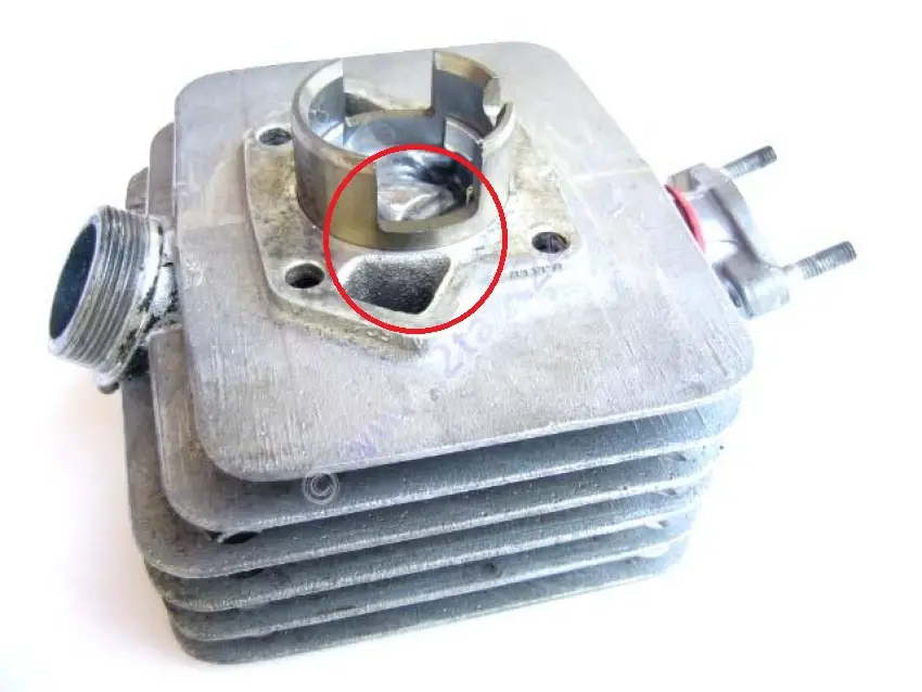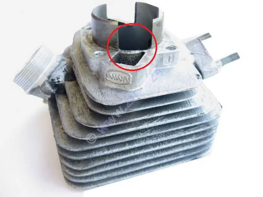 Warum wurde aber beispielsweise beim S50-Zylinder die Kante entfernt und beim S51-Zylinder nicht? Gilt dies als bedachte Drosselung? Denn wenn man die Kante auf folgendem Bild so bearbeiten würde, dann würe doch bei gleicher Überströmsteuerzeit dennoch mehr Gemisch in den Brennraum gelangen oder nicht?
