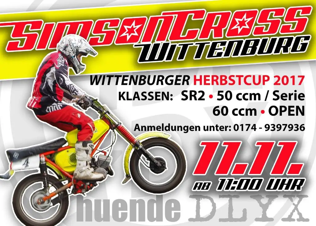Am 11.11.2017 sind alle Simsonfanatiker eingeladen, vor der Winterpause nochmal eine Nase feinsten Zweitaktduft zu inhalieren. Es steht das 19. Simson-Cross in 19243 Wittenburg (Strecke bei Dreilützow) an. Wie ihr ja alle wisst ist am 11.11.Karneval`s Beginn. Daher haben wir uns überlegt wer mit Kostüm Starten will kann gerne über sein Schutzanzug ein Kostüm seiner Wahl tragen . Neben der etablierten, offenen Simsonklasse wird es ein weiteres Highlight in Form eines SR2/KR50-Rennens geben. Die sogenannten "Essigpisser" sind allen Ostfahrzeugfreunden ein Begriff und sollen der guten, volksfestartigen Stimmung die Krone aufsetzen. Es wird ab 11 Uhr die Kontolle der Fahrzeuge stattfinden und dann jeweils ein freies Training und zwei Wertungsläufe a 12min+2Runden ausgetragen. Am Ende des Tages gibt es ein Hauen und Stechen um den begehrten "Goldenen Helm" einen Wanderpokal,dessen Sieger mittels Handicap-Rennen ermittelt wird.