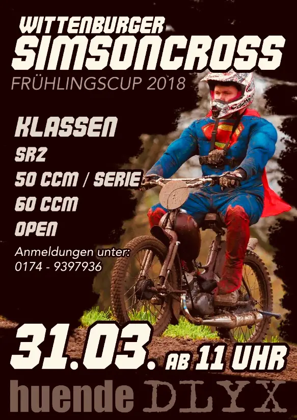 Am 31.03.2018 sind alle Simsonfanatiker eingeladen, nach der Winterpause wieder eine Nase feinsten Zweitaktduft zu inhalieren. Es steht das 20. Simson-Cross in 19243 Wittenburg (Strecke bei Dreilützow) an. Neben der etablierten, offenen Simsonklasse wird es ein weiteres Highlight in Form eines SR2/KR50-Rennens geben. Die sogenannten "Essigpisser" sind allen Ostfahrzeugfreunden ein Begriff und sollen der guten, volksfestartigen Stimmung die Krone aufsetzen. Es wird ab 11 Uhr jeweils ein freies Training und zwei Wertungsläufe a 12min+2Runden ausgetragen. Am Ende des Tages gibt es ein Hauen und Stechen um den begehrten "Goldenen Helm" einen Wanderpokal,dessen Sieger mittels Handicap-Rennen ermittelt wird. Interessierte Simsonfahrer können sich ab sofort anmelden: 0174/9397936 (gerne per whatsapp oder telefonisch). Für Verpflegung in fester und vor allem flüssiger Form ist bestens gesorgt.