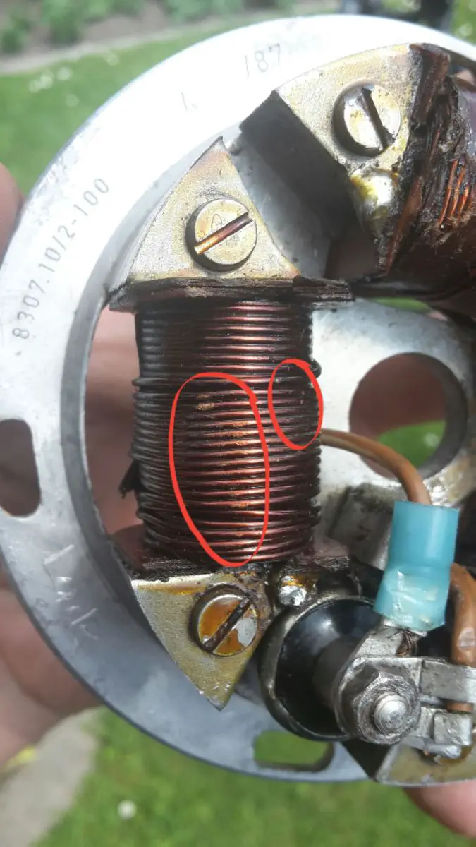Der Schrumpfschlauch an den Spulenanschlussen ist nicht original. Die Lötstellen sehen suspekt aus, könnten aber auch ok sein. Lässt sich schwer sagen.