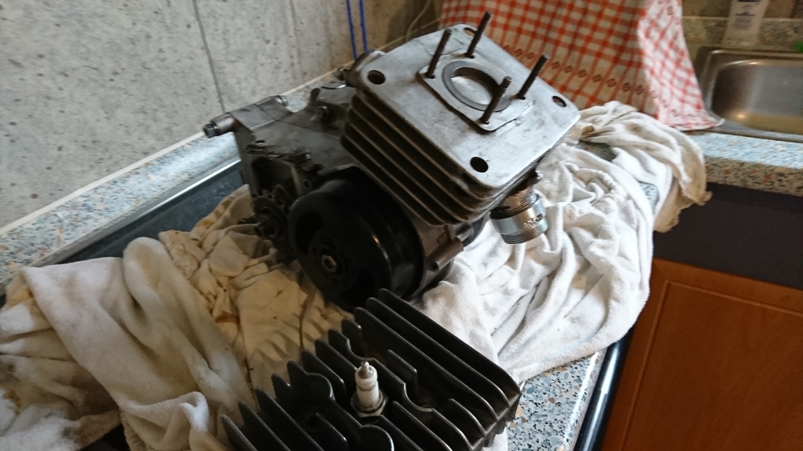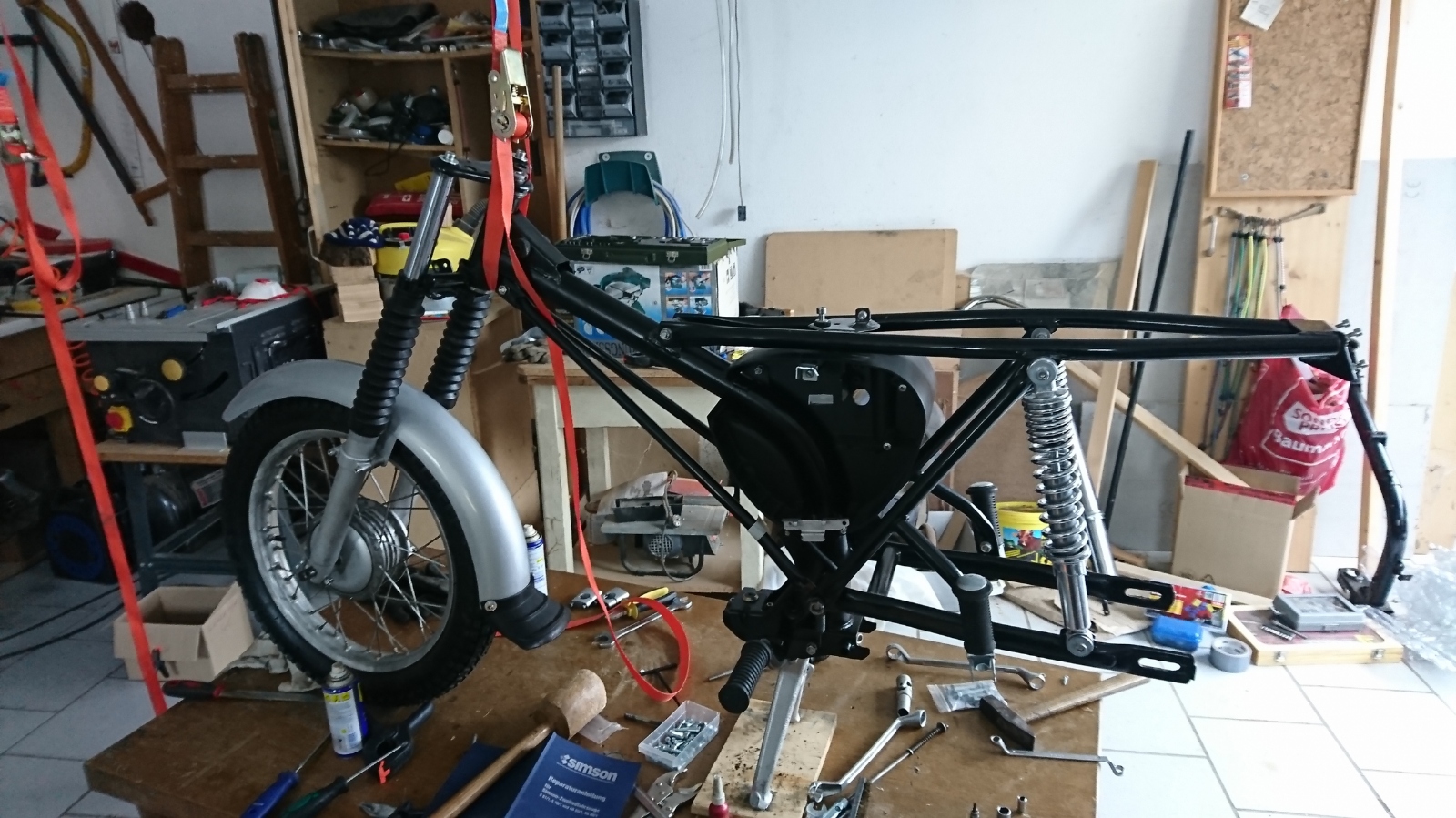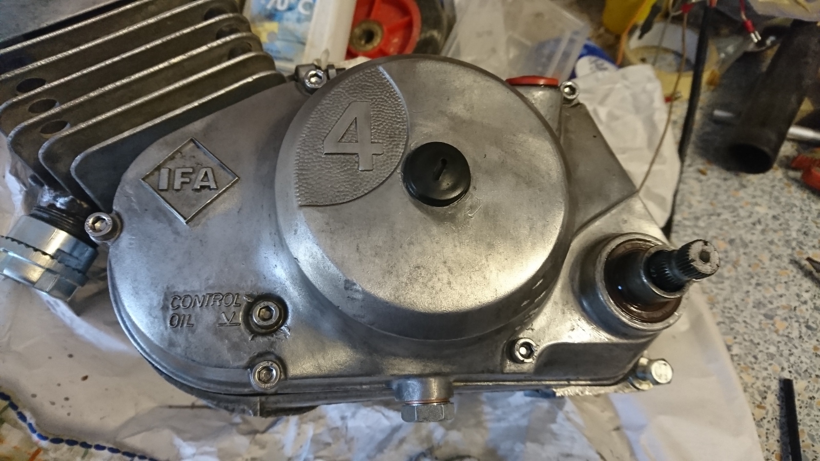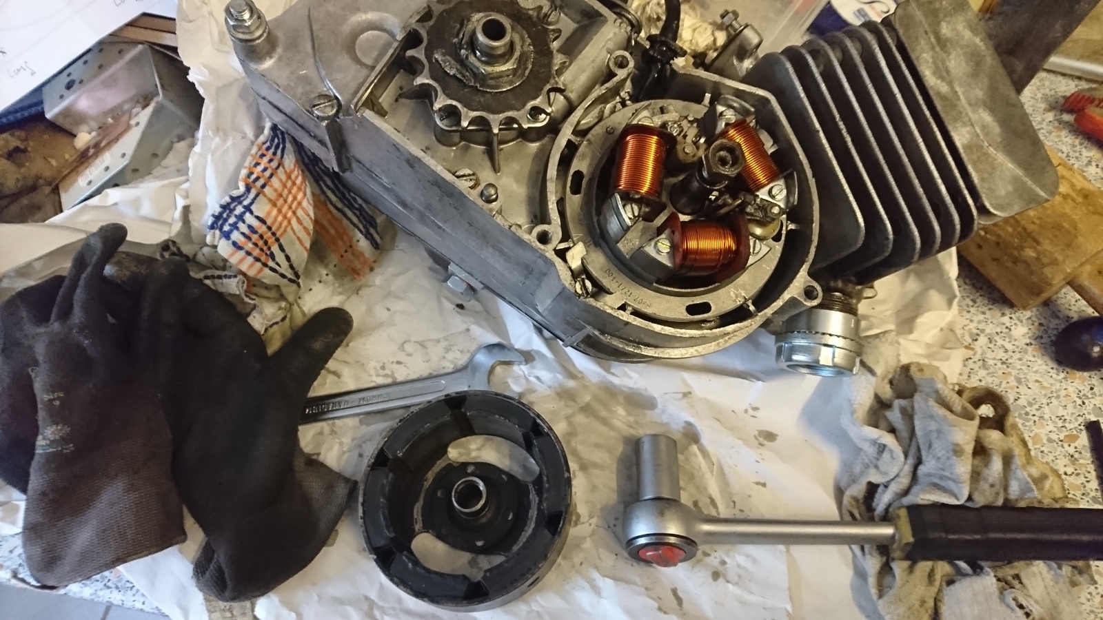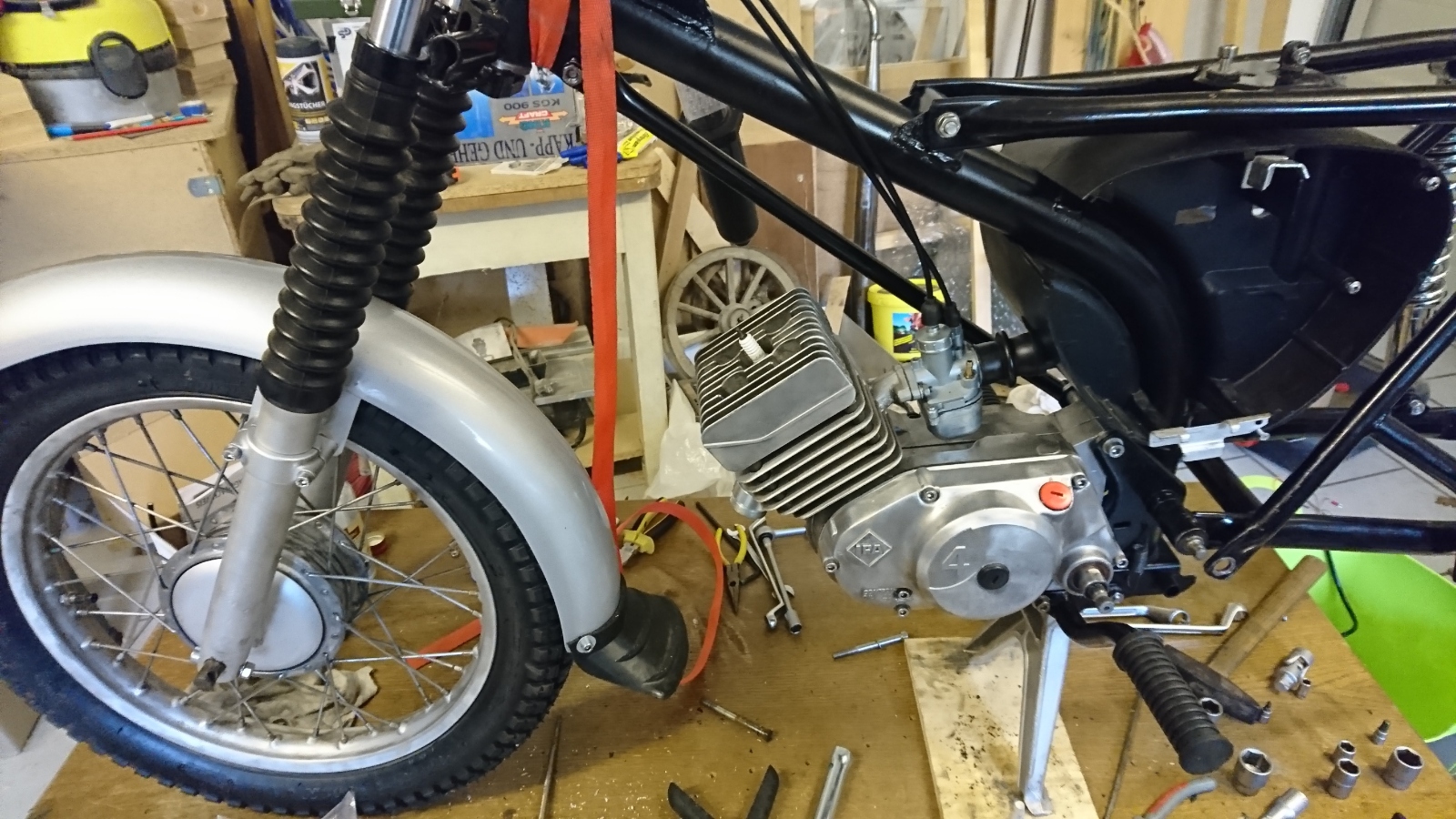 Seit heute ist der Motor endlich wieder mal an einem Stück, Gangschaltung ist (hoffentlich richtig) eingestellt, Grundplatte und Rotor der VAPE sind drin, Zündzeitpunkt eingestellt und der Motor hängt wieder im Rahmen.